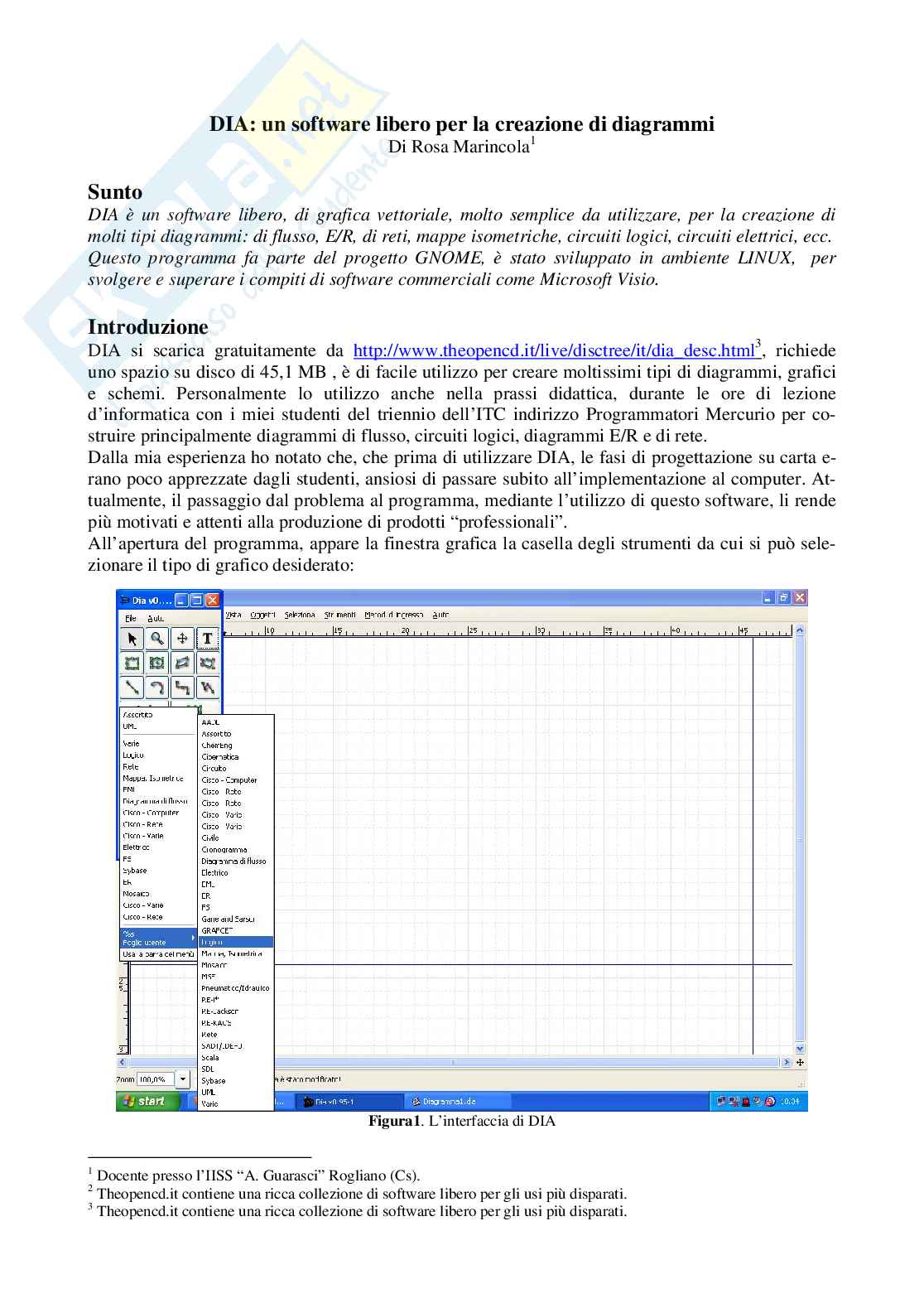 DIA é un software libero, di grafica vettoriale, molto semplice da utilizzare, per la creazione di molti tipi diagrammi: di flusso, E/R, di reti, mappe isometriche, circuiti logici, circuiti elettrici, ecc. Questo programma fa parte del progetto GNOME, é stato sviluppato in ambiente LINUX, per svolgere e superare i compiti di software commerciali come Microsoft Visio.
