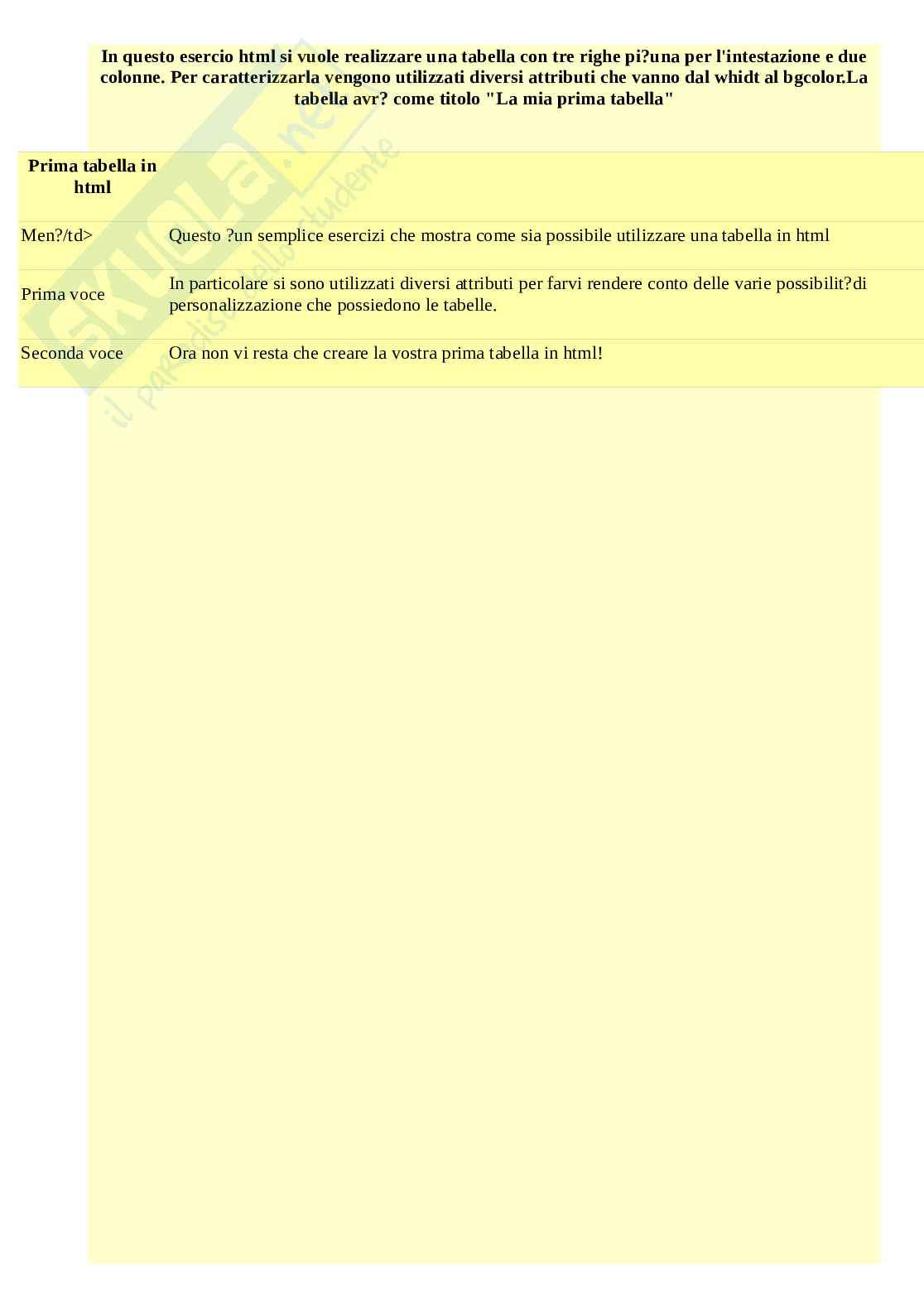 In questo esercizio html è realizzato un semplice tabella che ha lo scopo di andare a provare l'utilità di diversi attribui come ad esempio:width, bgcolor e alcuni tag come th e caption. In particolare viene realizzato una tabella che abbia subito sopra di essa una semplice descrizione e che preveda: