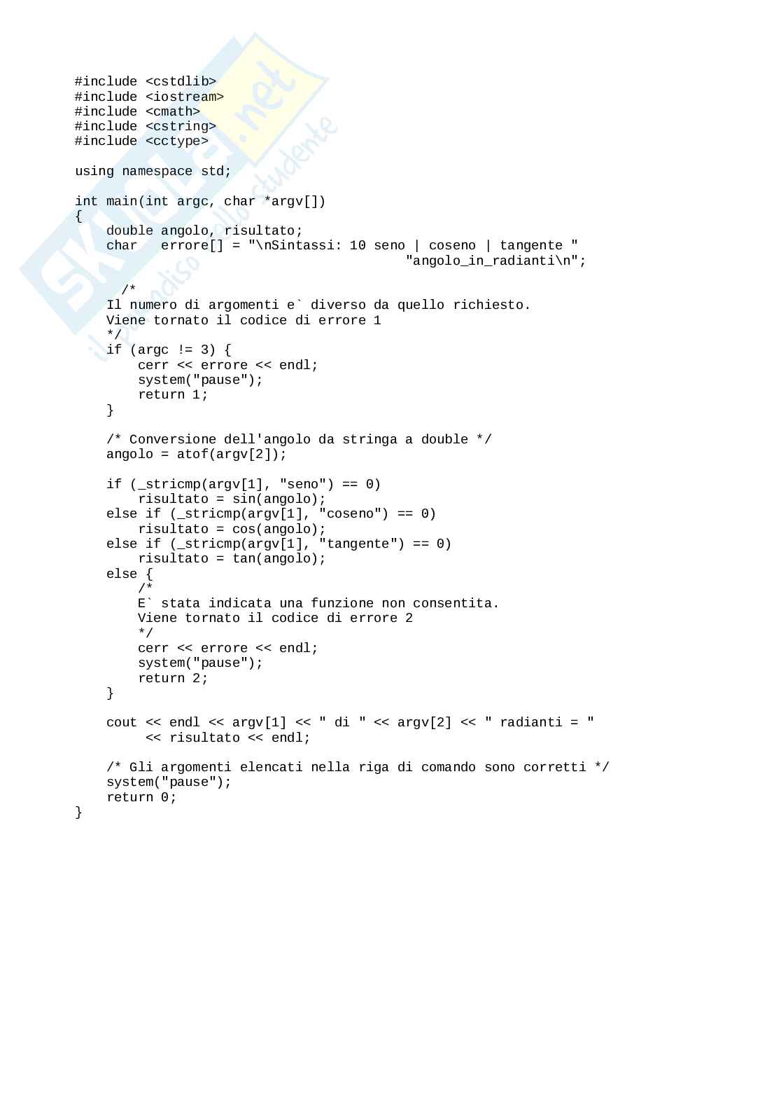 Per provarlo in Dev-C++, dal menu Esegui selezionare il comando Parametri...Nella finestra di dialogo, nella casella di testo: Parametri da passare al programma scrivere la funzione desiderata, ad esempio seno 1.57.