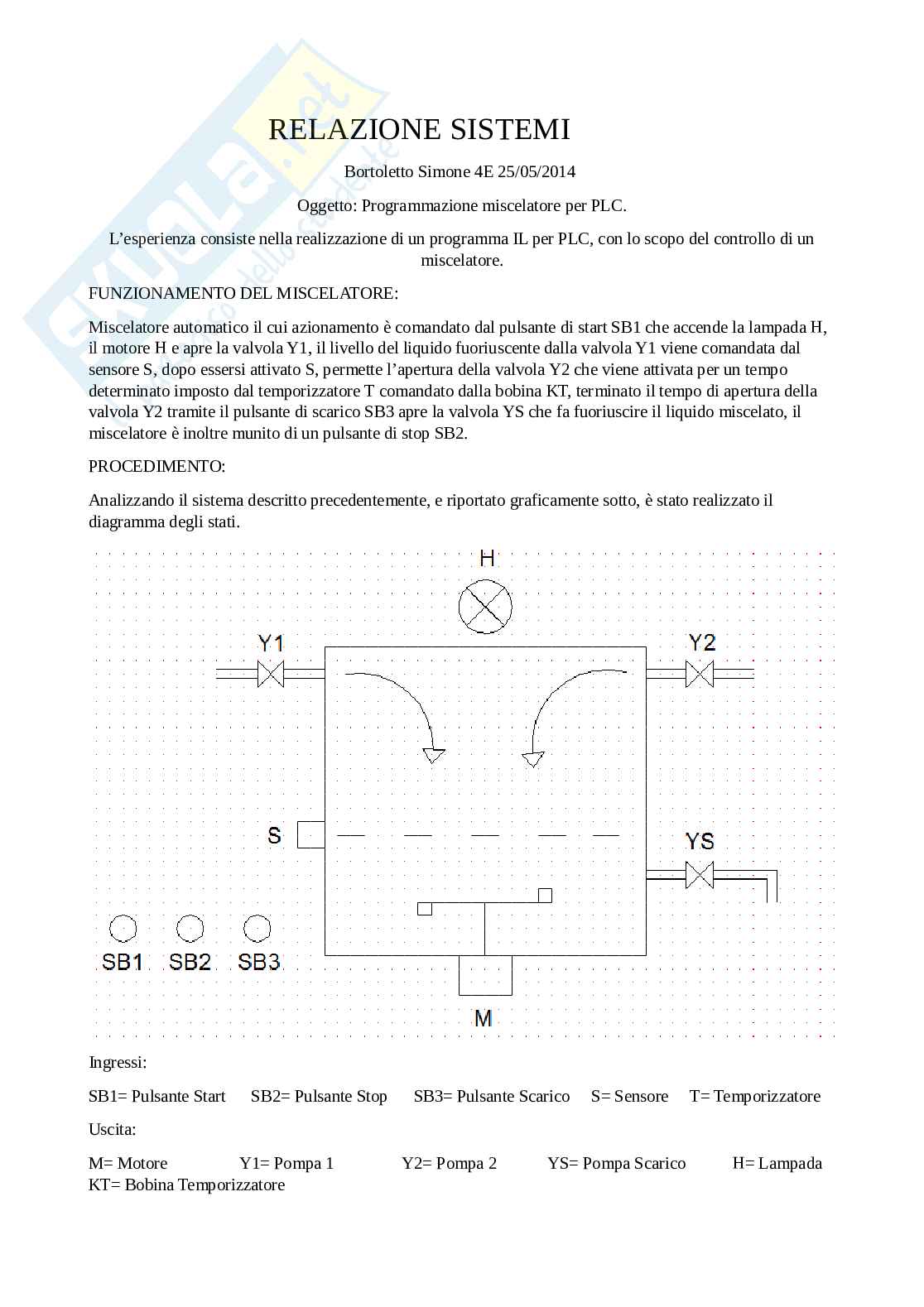 Miscelatore automatico il cui azionamento è comandato dal pulsante di start SB1 che accende la lampada H, il motore H e apre la valvola Y1, il livello del liquido fuoriuscente dalla valvola Y1 viene comandata dal sensore S, dopo essersi attivato S, permette l’apertura della valvola Y2 che viene attivata per un tempo determinato imposto dal temporizzatore T comandato dalla bobina KT, terminato il tempo di apertura della valvola Y2 tramite il pulsante di scarico SB3 apre la valvola YS che fa fuoriuscire il liquido miscelato, il miscelatore è inoltre munito di un pulsante di stop SB2.