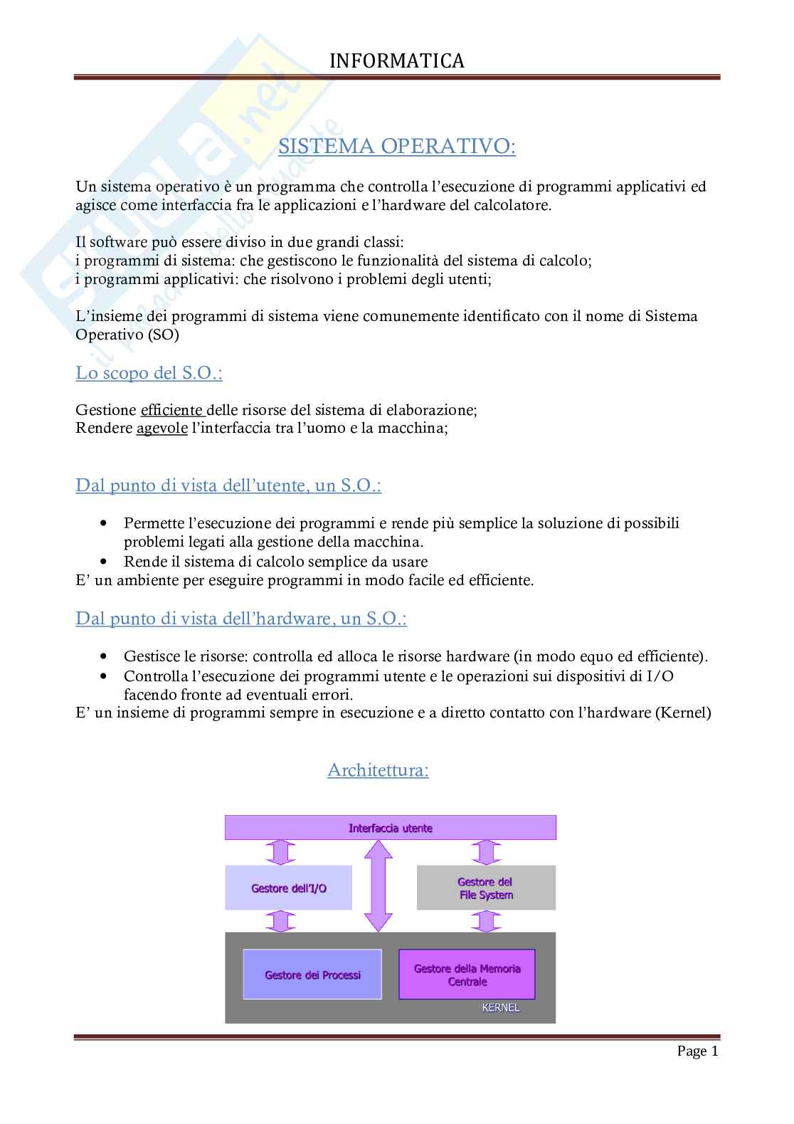 Appunto di informatica che fornisce in un allegato la descrizione della caratteristiche principali del Sistema Operativo.