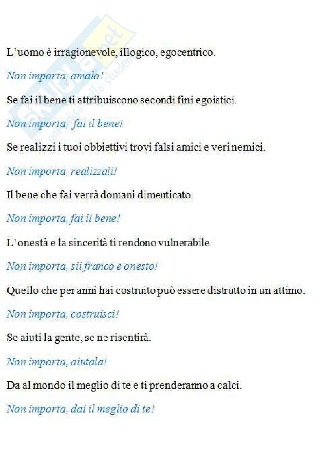 Questa bellissima riflessione di Madre Teresa può essere considerata un vademecum per vivere la propria vita nella pienezza e nella realizzazione di sé. Madre Teresa invita ciascuno di noi ad amare il prossimo al di là dei suoi meriti, in modo disinteressato. Ci stimola a raggiungere i nostri obbiettivi compiendo sempre il bene, consapevoli che non sempre tutti possono condividerli. L’onestà e la sincerità sono la vera forza che ci permettono di essere sempre noi stessi, anche se all’apparenza, questi valori, possono essere considerati segno di debolezza e fragilità. Madre Teresa ci incoraggia a non preoccuparci se tutto ciò che abbiamo costruito in tanti anni in un attimo viene distrutto, perché l’importante è continuamente darsi da fare e ripartire. Aiutare gli altri è quello che più conta, solo se il cuore è libero da ogni interesse e tornaconto. Madre Teresa conclude il suo pensiero invitandoci a far emergere e fruttare i talenti che ognuno di noi, unico e irripetibile, possiede dentro di sé come un tesoro, sapendo che questo potrebbe infastidire qualcuno. In una parola, questa grande Beata, ci invita a vivere nella libertà, intesa come capacità di realizzare sé stessi attraverso L’Amore autentico.