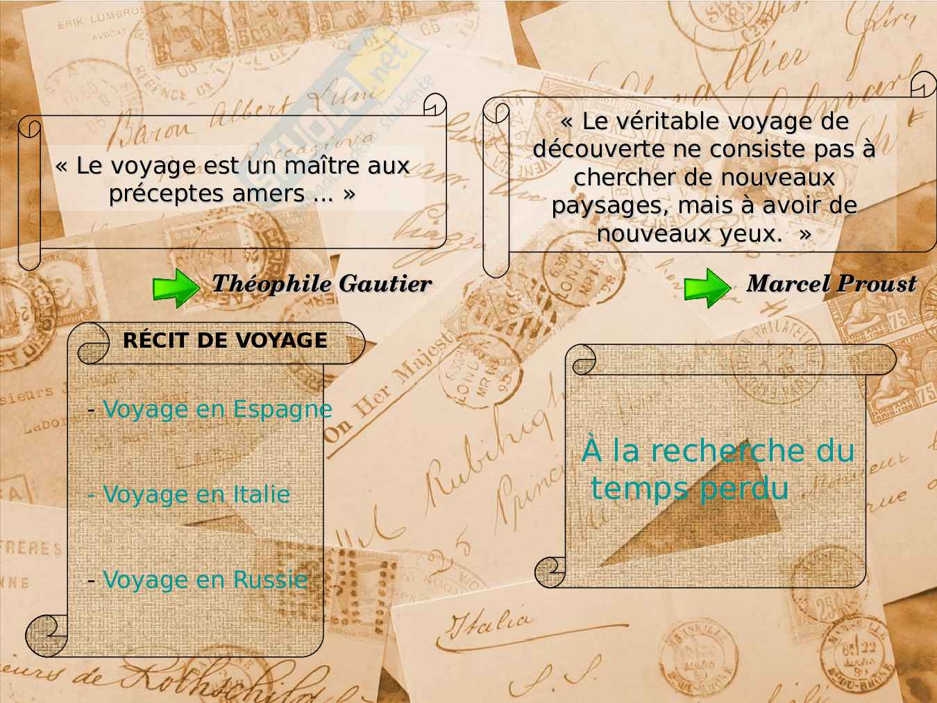 Récit de voyage (T. Gautier - Voyage en Espagne, Voyage en Italie - Voyage en Russie) (M. Proust À la recherche du temps perdu ). In questo allegato quindi viene presentato il tema del viaggio attraverso i grandi intellettuali francesi, come per esempio Marcel Proust e Gautier.