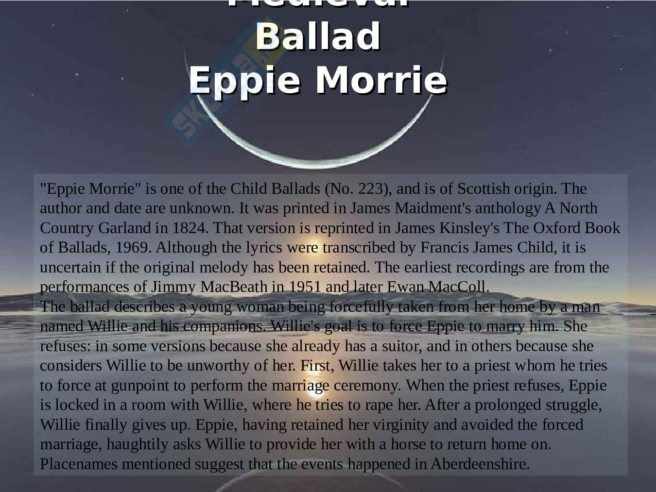 Analisi e differenza tra due ballate medievale e moderna in lingua inglese Eppie Morie a At the beginning. In questo allegato è presente quindi l'analisi di queste due ballate. Vengono riportati i testi delle due ballate e un commento sulle opere degli autori che li hanno prodotti.