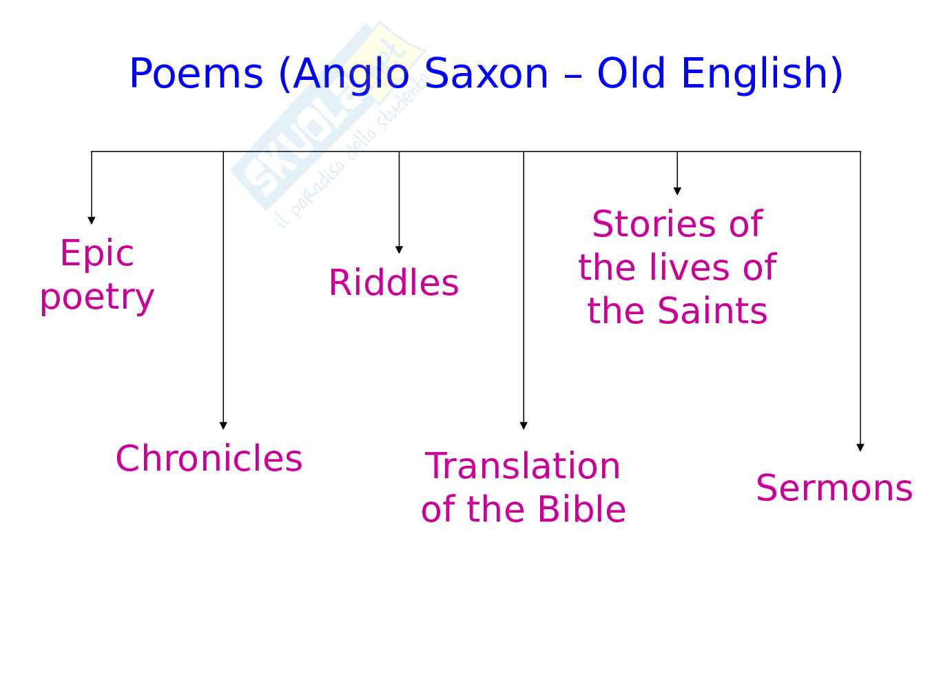 Appunto di Letteratura inglese che descrive, con uno schema in allegato, i seguenti generi letterari: Poems Anglo Saxon – Old English, The most important works (Beowulf and Caedmon's Hymn), The Heroic Pre-Christian poetry and The Christian Poetry. Kenning=A figurative expression, usually compound in form, that is used in place of a name or noun.