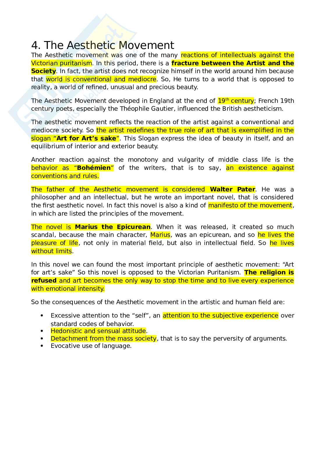In this novel we can found the most important principle of aesthetic movement: “Art for art’s sake” So this novel is opposed to the Victorian Puritanism. The religion is refused and art becomes the only way to stop the time and to live every experience with emotional intensity.