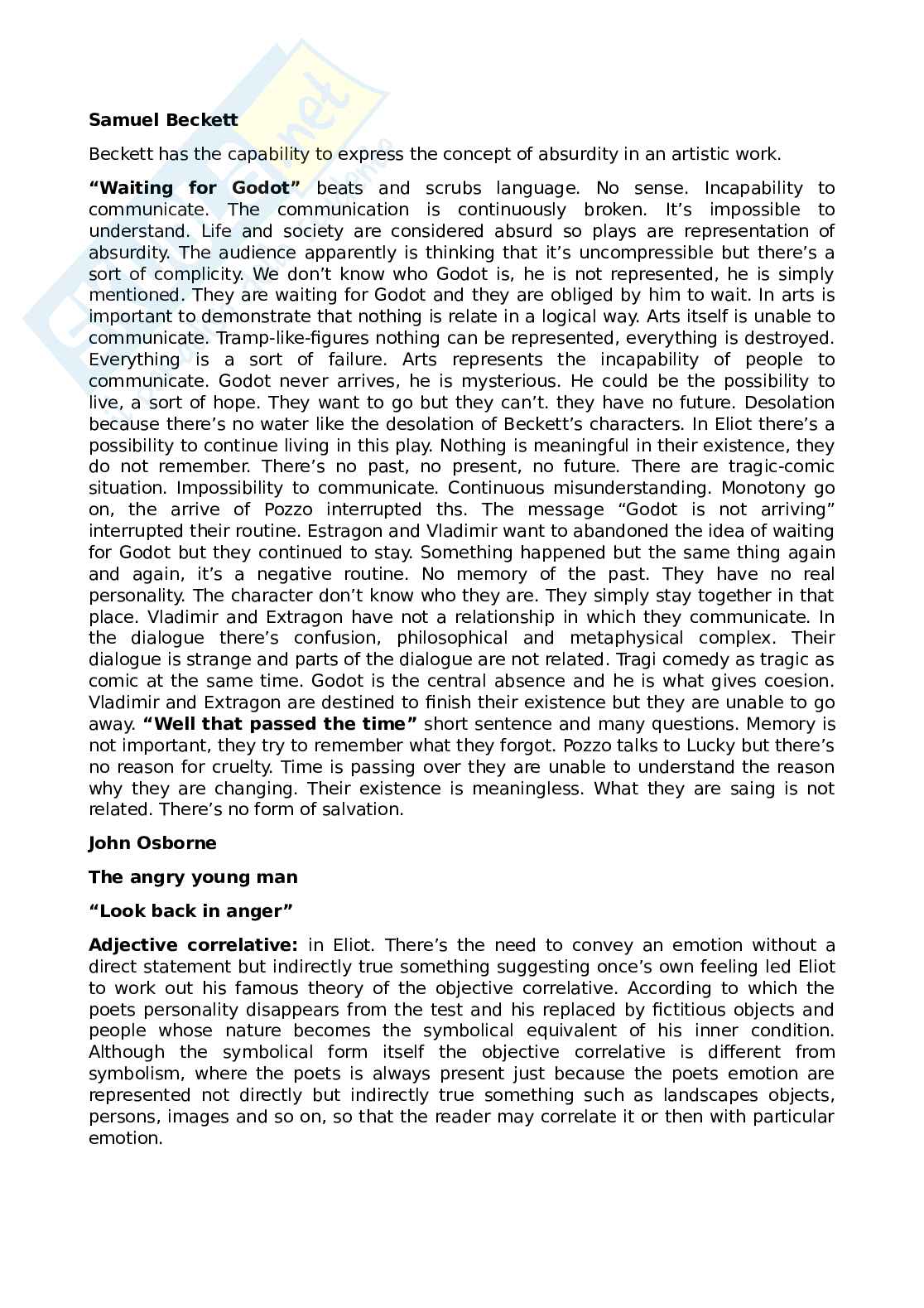 “Waiting for Godot” beats and scrubs language. No sense. Incapability to communicate. The communication is continuously broken. It’s impossible to understand. Life and society are considered absurd so plays are representation of absurdity. The audience apparently is thinking that it’s uncompressible but there’s a sort of complicity. We don’t know who Godot is, he is not represented, he is simply mentioned. They are waiting for Godot and they are obliged by him to wait. In arts is important to demonstrate that nothing is relate in a logical way. Arts itself is unable to communicate. Tramp-like-figures nothing can be represented, everything is destroyed. Everything is a sort of failure. Arts represents the incapability of people to communicate. Godot never arrives, he is mysterious. He could be the possibility to live, a sort of hope. They want to go but they can’t. they have no future. Desolation because there’s no water like the desolation of Beckett’s characters. In Eliot there’s a possibility to continue living in this play. Nothing is meaningful in their existence, they do not remember. There’s no past, no present, no future. There are tragic-comic situation. Impossibility to communicate. Continuous misunderstanding. Monotony go on, the arrive of Pozzo interrupted ths. The message “Godot is not arriving” interrupted their routine. Estragon and Vladimir want to abandoned the idea of waiting for Godot but they continued to stay. Something happened but the same thing again and again, it’s a negative routine. No memory of the past. They have no real personality. The character don’t know who they are. They simply stay together in that place. Vladimir and Extragon have not a relationship in which they communicate. In the dialogue there’s confusion, philosophical and metaphysical complex. Their dialogue is strange and parts of the dialogue are not related. Tragi comedy as tragic as comic at the same time. Godot is the central absence and he is what gives coesion. Vladimir and Extragon are destined to finish their existence but they are unable to go away. “Well that passed the time” short sentence and many questions. Memory is not important, they try to remember what they forgot. Pozzo talks to Lucky but there’s no reason for cruelty. Time is passing over they are unable to understand the reason why they are changing. Their existence is meaningless. What they are saing is not related. There’s no form of salvation.