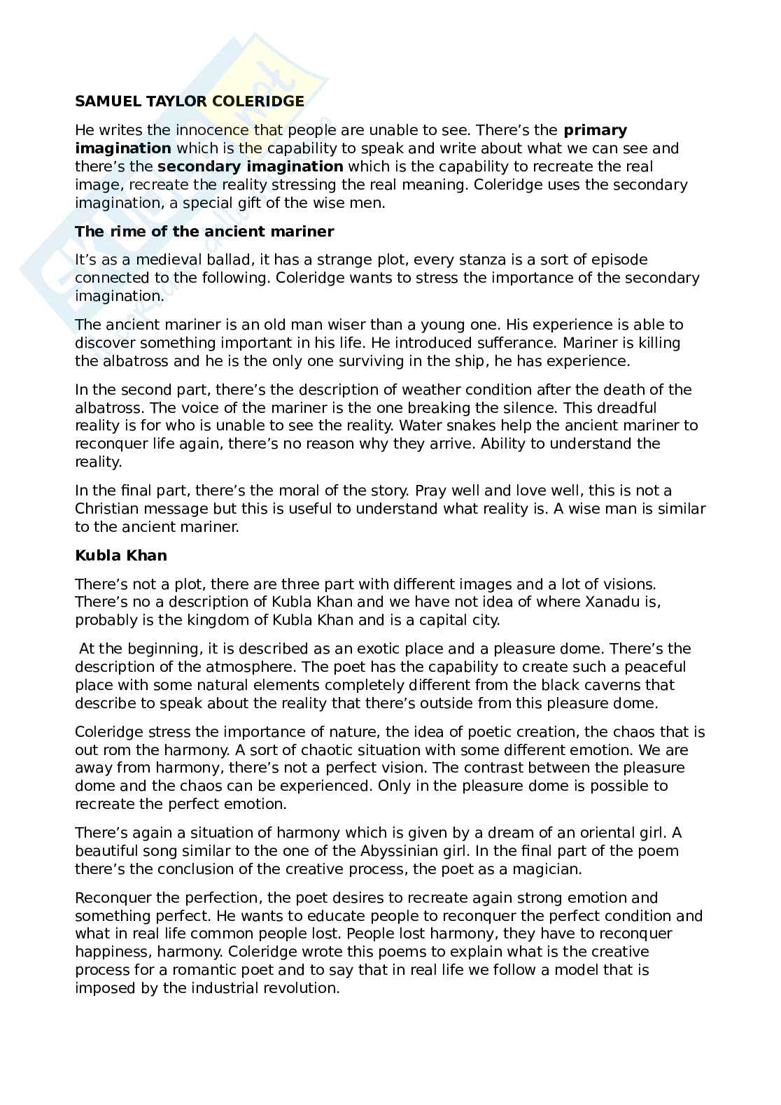It’s as a medieval ballad, it has a strange plot, every stanza is a sort of episode connected to the following. Coleridge wants to stress the importance of the secondary imagination.