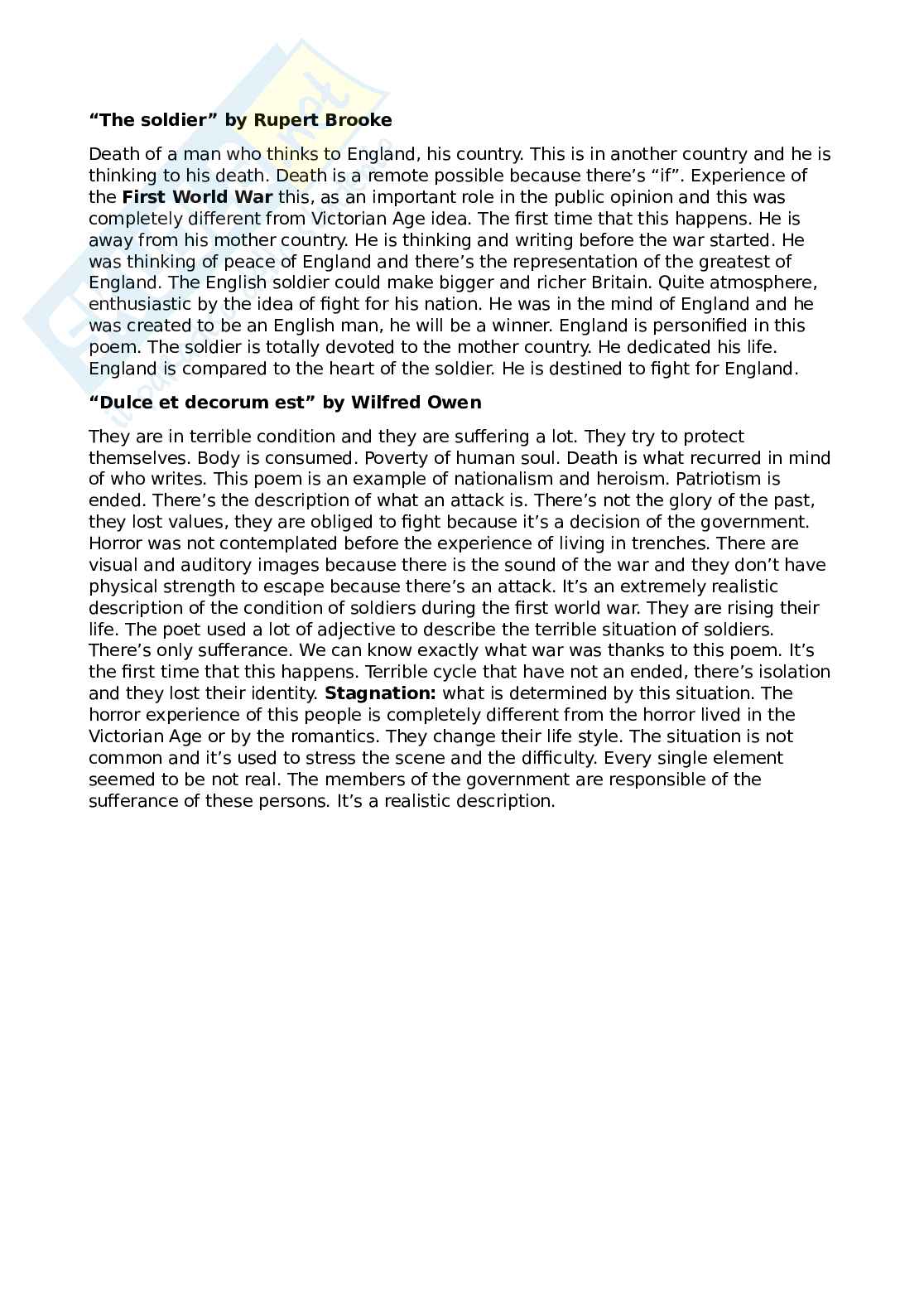 Death of a man who thinks to England, his country. This is in another country and he is thinking to his death. Death is a remote possible because there’s “if”. Experience of the First World War this, as an important role in the public opinion and this was completely different from Victorian Age idea. The first time that this happens. He is away from his mother country. He is thinking and writing before the war started. He was thinking of peace of England and there’s the representation of the greatest of England. The English soldier could make bigger and richer Britain. Quite atmosphere, enthusiastic by the idea of fight for his nation. He was in the mind of England and he was created to be an English man, he will be a winner. England is personified in this poem. The soldier is totally devoted to the mother country. He dedicated his life. England is compared to the heart of the soldier. He is destined to fight for England.