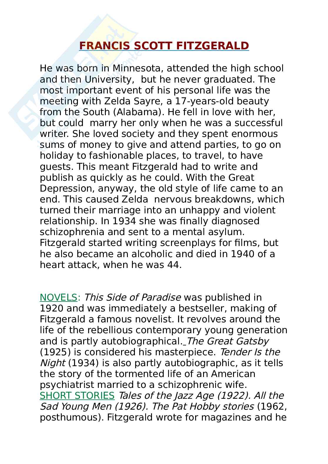 He was born in Minnesota, attended the high school and then University, but he never graduated. The most important event of his personal life was the meeting with Zelda Sayre, a 17-years-old beauty from the South (Alabama). He fell in love with her, but could marry her only when he was a successful writer. She loved society and they spent enormous sums of money to give and attend parties, to go on holiday to fashionable places, to travel, to have guests. This meant Fitzgerald had to write and publish as quickly as he could. With the Great Depression, anyway, the old style of life came to an end. This caused Zelda nervous breakdowns, which turned their marriage into an unhappy and violent relationship. In 1934 she was finally diagnosed schizophrenia and sent to a mental asylum. Fitzgerald started writing screenplays for films, but he also became an alcoholic and died in 1940 of a heart attack, when he was 44.