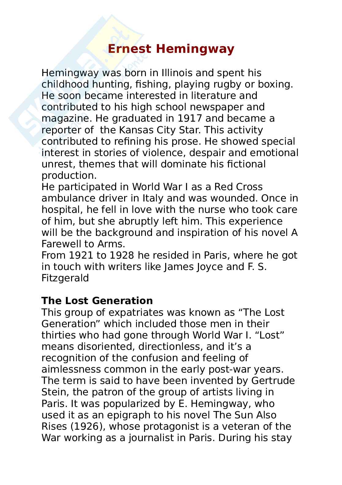 This group of expatriates was known as “The Lost Generation” which included those men in their thirties who had gone through World War I. “Lost” means disoriented, directionless, and it’s a recognition of the confusion and feeling of aimlessness common in the early post-war years. The term is said to have been invented by Gertrude Stein, the patron of the group of artists living in Paris. It was popularized by E. Hemingway, who used it as an epigraph to his novel The Sun Also Rises (1926), whose protagonist is a veteran of the War working as a journalist in Paris. During his stay in Paris, Hemingway started writing short stories. In 1924 he published In Our Time, a collection of short stories, first in France and a year later in the U.S.A. They mainly recall his childhood experiences. In 1926 he published The Sun Also Rises, which already focused on the qualities Hemingway considered the most valuable in men: courage, comradeship and endurance when faced with violence. In 1929 he published A Farewell to Arms.