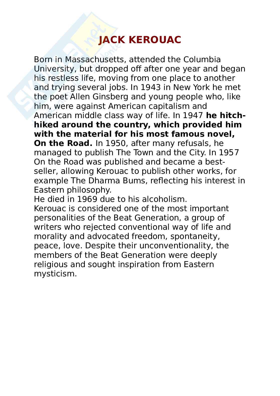 In 1947 he hitch-hiked around the country, which provided him with the material for his most famous novel, On the Road. In 1950, after many refusals, he managed to publish The Town and the City. In 1957 On the Road was published and became a best-seller, allowing Kerouac to publish other works, for example The Dharma Bums, reflecting his interest in Eastern philosophy.