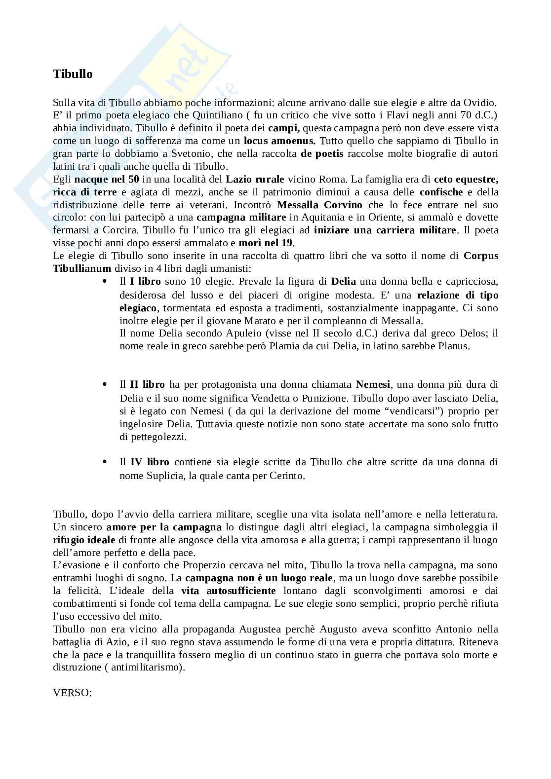 E’ il primo poeta elegiaco che Quintiliano (fu un critico che vive sotto i Flavi negli anni 70 d.C.) abbia individuato. Tibullo è definito il poeta dei campi, questa campagna però non deve essere vista come un luogo di sofferenza ma come un locus amoenus. Tutto quello che sappiamo di Tibullo in gran parte lo dobbiamo a Svetonio, che nella raccolta de poetis raccolse molte biografie di autori latini tra i quali anche quella di Tibullo.