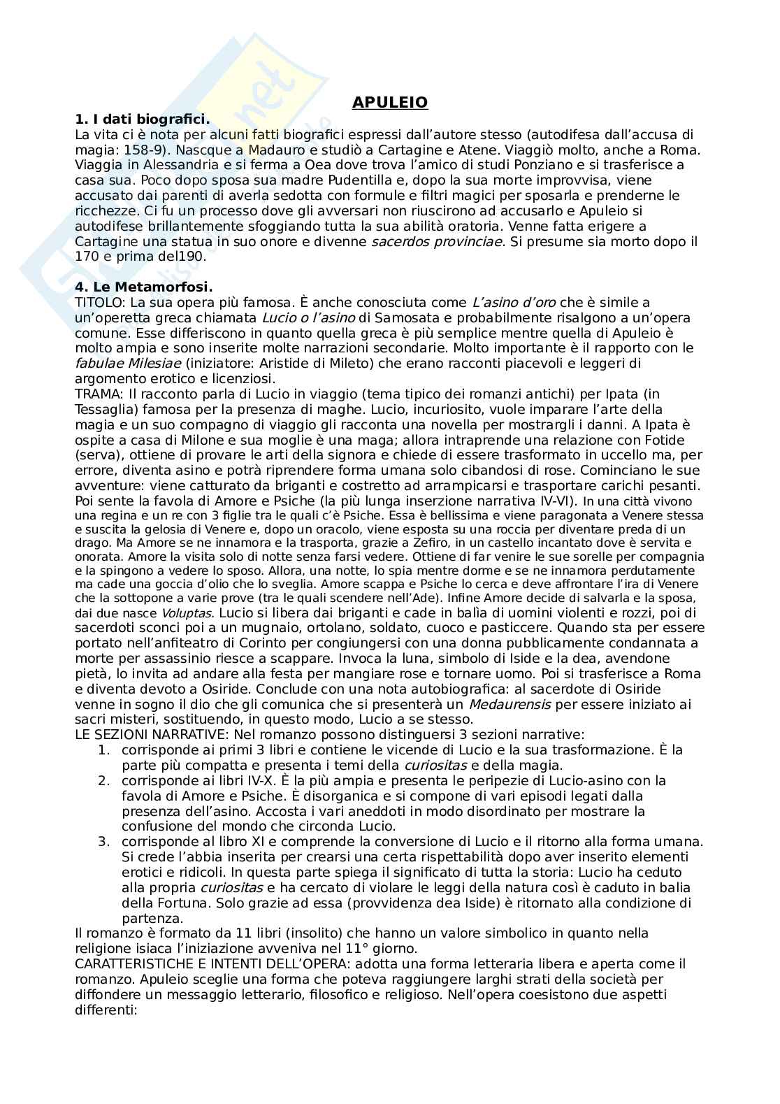 La sua opera più famosa è anche conosciuta come L’asino d’oro che è simile a un’operetta greca chiamata Lucio o l’asino di Samosata e probabilmente risalgono a un’opera comune. Esse differiscono in quanto quella greca è più semplice mentre quella di Apuleio è molto ampia ed è ricca di molte narrazioni secondarie. Molto importante è il rapporto con le fabulae Milesiae (iniziatore: Aristide di Mileto) che erano racconti piacevoli e leggeri di argomento erotico e licenzioso.