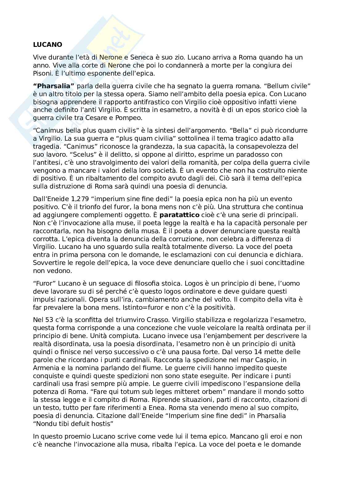 - “Pharsalia” parla della guerra civile che ha segnato la guerra romana. “Bellum civile” è un altro titolo per la stessa opera. Siamo nell’ambito della poesia epica. Con Lucano bisogna apprendere il rapporto antifrastico con Virgilio cioè oppositivo, infatti viene anche definito l’anti Virgilio. È scritta in esametro, la novità è di un epos storico cioè la guerra civile tra Cesare e Pompeo.