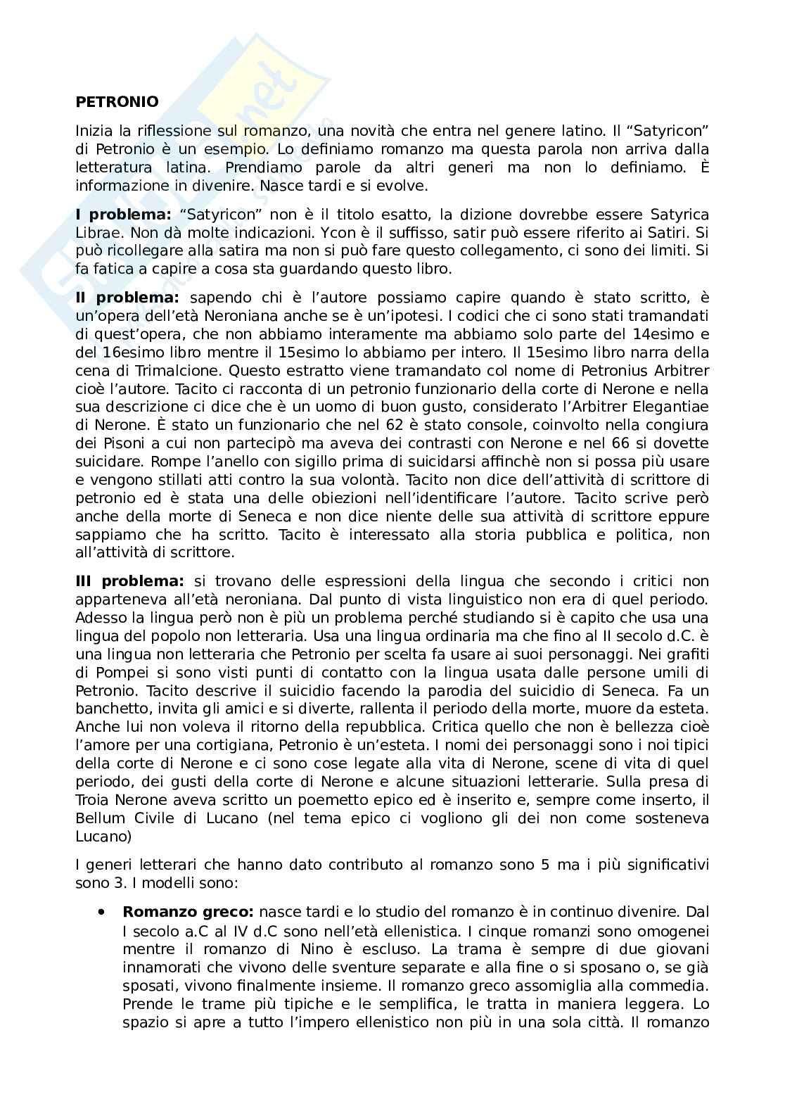 - III problema: si trovano delle espressioni della lingua che secondo i critici non apparteneva all’età neroniana. Dal punto di vista linguistico non era di quel periodo. Adesso la lingua però non è più un problema perché studiando si è capito che usa una lingua del popolo, non letteraria. Usa una lingua ordinaria ma che fino al II secolo d.C. è una lingua non letteraria che Petronio per scelta fa usare ai suoi personaggi. Nei grafiti di Pompei si sono visti punti di contatto con la lingua usata dalle persone umili di Petronio. Tacito descrive il suicidio facendo la parodia del suicidio di Seneca. Fa un banchetto, invita gli amici e si diverte, rallenta il periodo della morte, muore da esteta. Anche lui non voleva il ritorno della repubblica. Critica quello che non è bellezza, cioè l’amore per una cortigiana, Petronio è un esteta. I nomi dei personaggi sono i nomi tipici della corte di Nerone e ci sono cose legate alla vita di Nerone, scene di vita di quel periodo, dei gusti della corte di Nerone e alcune situazioni letterarie. Sulla presa di Troia Nerone aveva scritto un poemetto epico ed è inserito, sempre come inserto, il Bellum Civile di Lucano (nel tema epico ci vogliono gli dei non come sosteneva Lucano).