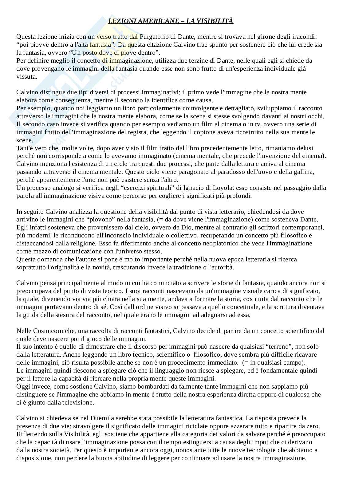 In seguito Calvino analizza la questione della visibilità dal punto di vista letterario, chiedendosi da dove arrivino le immagini che “piovono” nella fantasia, (= da dove viene l'immaginazione) come sosteneva Dante.