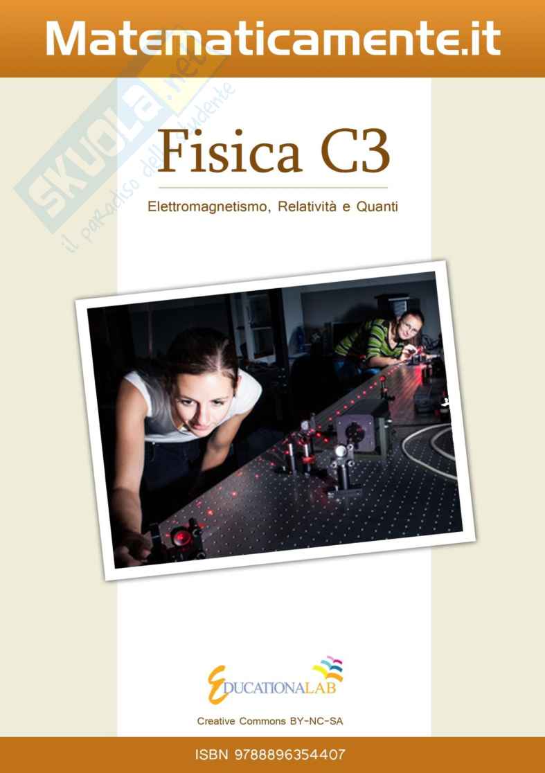 Questo ebook di fisica su elettromagnetismo, relatività e quanti fa parte di una collana di ebook con licenza Creative Commons BY-SA per la scuola. Il titolo Fisica C3 vuole indicare che il progetto è stato realizzato in modalità Collaborativa e con licenza Creative Commons, da cui le tre "C" del titolo. Non vuole essere un trattato completo sull'argomento ma una sintesi sulla quale l'insegnante può basare la sua lezione, indicando poi testi e altre fonti per gli approfondimenti. Lo studente può consultarlo come riferimento essenziale da cui partire per approfondire. In sostanza l'idea è stata quella di indicare il nocciolo essenziale della disciplina, nocciolo largamente condiviso dagli insegnanti. La licenza Creative Commons scelta permette non solo di fruire liberamente l'ebook ma anche di modificarlo e personalizzarlo secondo le esigenze dell'insegnante e della classe. Chiunque può contribuire a migliore questo ebook, segnalando integrazioni, modifiche e sviste al coordinatore del progetto . Il libro è pensato per lo studio della fisica del quinto anno del liceo.
