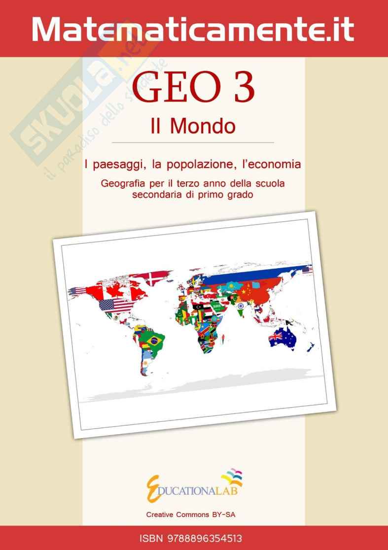 Questo ebook di Geografia per il terzo anno della secondiaria di primo grado fa parte di una collana di ebook con licenza Creative Commons BY-SA per la scuola. Non vuole essere un trattato completo sull'argomento ma una sintesi sulla quale l'insegnante può basare la lezione, indicando poi testi e altre fonti per gli approfondimenti. Lo studente può consultarlo come riferimento essenziale da cui partire per approfondire. La licenza Creative Commons, con la quale viene rilasciato, permette non solo di fruire liberamente l'ebook ma anche di modificarlo e personalizzarlo secondo le esigenze dell'insegnante e della classe. Chiunque può contribuire a migliorare questo ebook, segnalando integrazioni, modifiche e sviste al coordinatore del progetto .