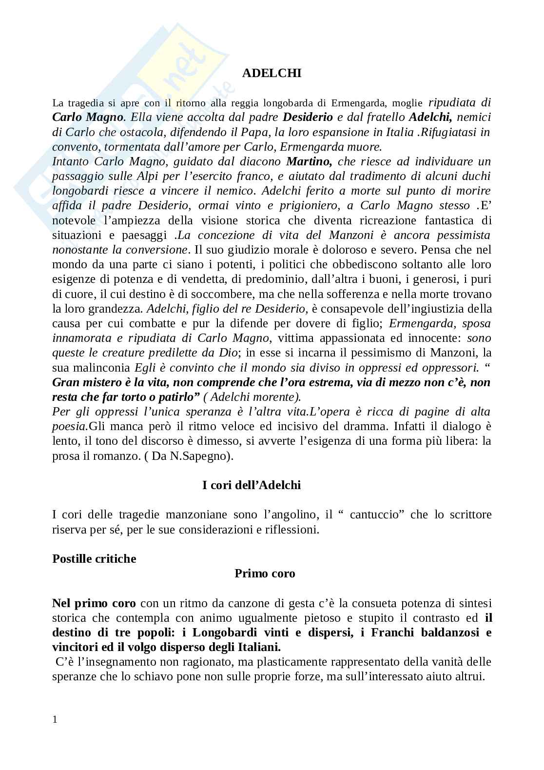 La tragedia si apre con il ritorno alla reggia longobarda di Ermengarda, moglie ripudiata di Carlo Magno. Ella viene accolta dal padre Desiderio e dal fratello Adelchi, nemici di Carlo che ostacola, difendendo il Papa, la loro espansione in Italia .Rifugiatasi in convento, tormentata dall’amore per Carlo, Ermengarda muore. Intanto Carlo Magno, guidato dal diacono Martino, che riesce ad individuare un passaggio sulle Alpi per l’esercito franco, e aiutato dal tradimento di alcuni duchi longobardi riesce a vincere il nemico. Adelchi ferito a morte sul punto di morire affida il padre Desiderio, ormai vinto e prigioniero, a Carlo Magno stesso .E’ notevole l’ampiezza della visione storica che diventa ricreazione fantastica di situazioni e paesaggi .La concezione di vita del Manzoni è ancora pessimista nonostante la conversione. Il suo giudizio morale è doloroso e severo. Pensa che nel mondo da una parte ci siano i potenti, i politici che obbediscono soltanto alle loro esigenze di potenza e di vendetta, di predominio, dall’altra i buoni, i generosi, i puri di cuore, il cui destino è di soccombere, ma che nella sofferenza e nella morte trovano la loro grandezza. Adelchi, figlio del re Desiderio, è consapevole dell’ingiustizia della causa per cui combatte e pur la difende per dovere di figlio; Ermengarda, sposa innamorata e ripudiata di Carlo Magno, vittima appassionata ed innocente: sono queste le creature predilette da Dio; in esse si incarna il pessimismo di Manzoni, la sua malinconia Egli è convinto che il mondo sia diviso in oppressi ed oppressori. “ Gran mistero è la vita, non comprende che l’ora estrema, via di mezzo non c’è, non resta che far torto o patirlo” ( Adelchi morente).