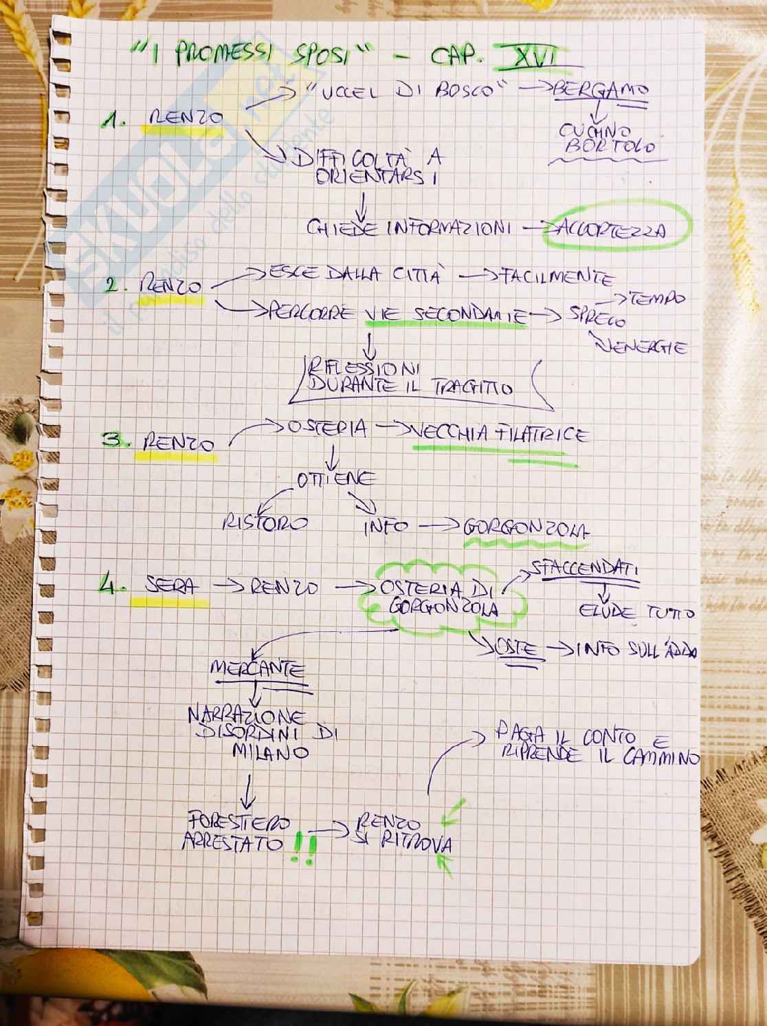 Prima di sera, egli giunge nello stesso paesino e si ferma in un’osteria, così da raccogliere alcune informazioni su come attraversare l’Adda e giungere finalmente dal cugino come pianificato; nell’osteria si trovano degli sfaccendati, intenti a discutere degli avvenimenti più recenti di Milano: questi, incuriositi, pongono a Renzo numerose domande, che però quest’ultimo è bravo a eludere.