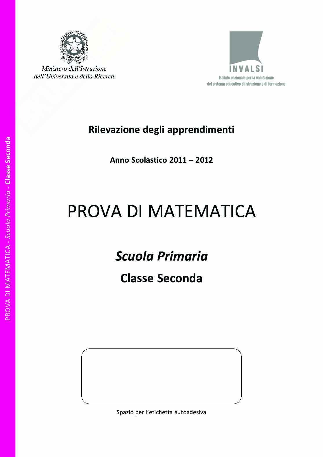 Prova INVALSI per la classe seconda della scuola primaria anno scolastico 2011-2012, prova di matematica, semplici problemi con le operazioni, riconoscimento di figure piane e di solidi, piano cartesiano, percorsi in un reticolo, simmetrie, operazioni inverse, calcoli con le monete, numeri sulla retta, statistica e rappresentazione tabulare di dati, serie di numeri, l'orologio...