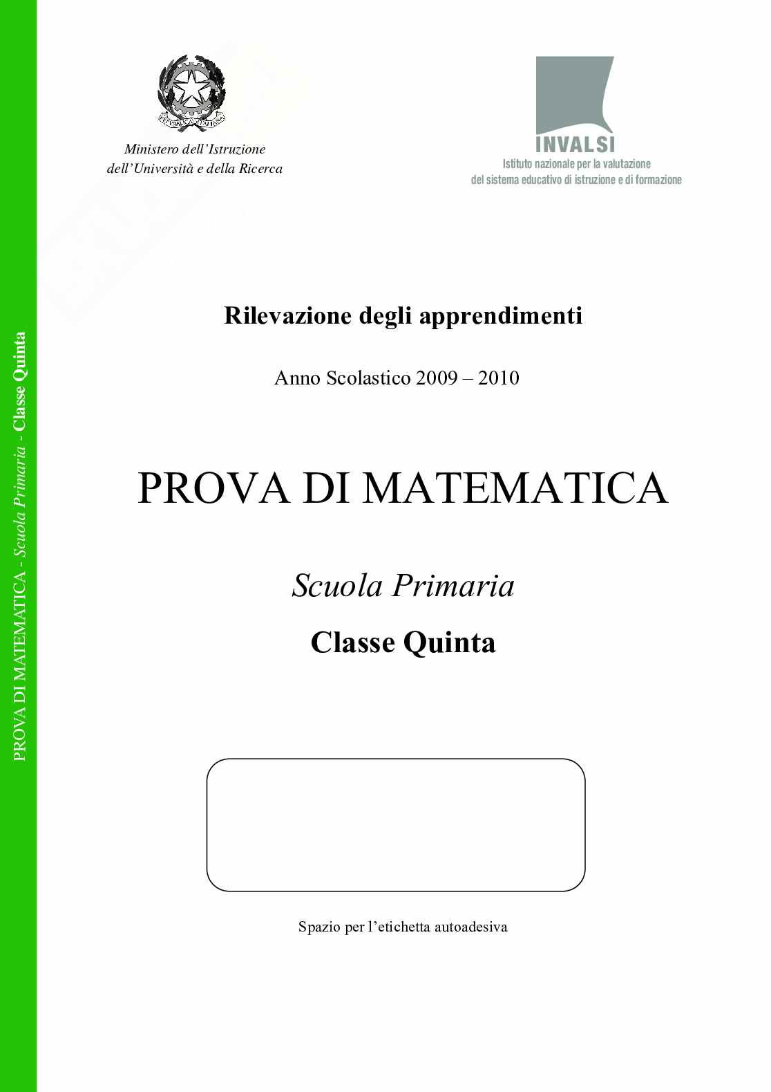 Prova INVALSI per la classe quinta della scuola primaria anno scolastico 2009-2010, prova di matematica, problemi con le operazioni, riconoscimento di figure piane, piano cartesiano, calcolo mentale, operazioni inverse, serie numeriche, statistica e rappresentazione tabulare di dati, probabilità... Scarica il test originale nel formato PDF