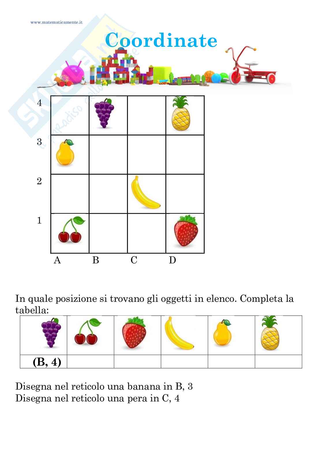 In queste schede bisogna individuare la posizione di un oggetto/animale in un reticolo, disegnare un oggetto in una posizione individuata dalla coppia di coordinate, riconoscere un percorso all'interno del reticolo... e altri quesiti analoghi. Schede da stampare per bambini della scuola primaria.