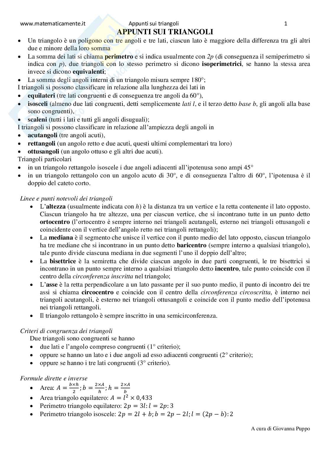 Scheda sintetica sui triangoli, appunti con definizioni, proprietà, teoremi, formule sui triangolo.