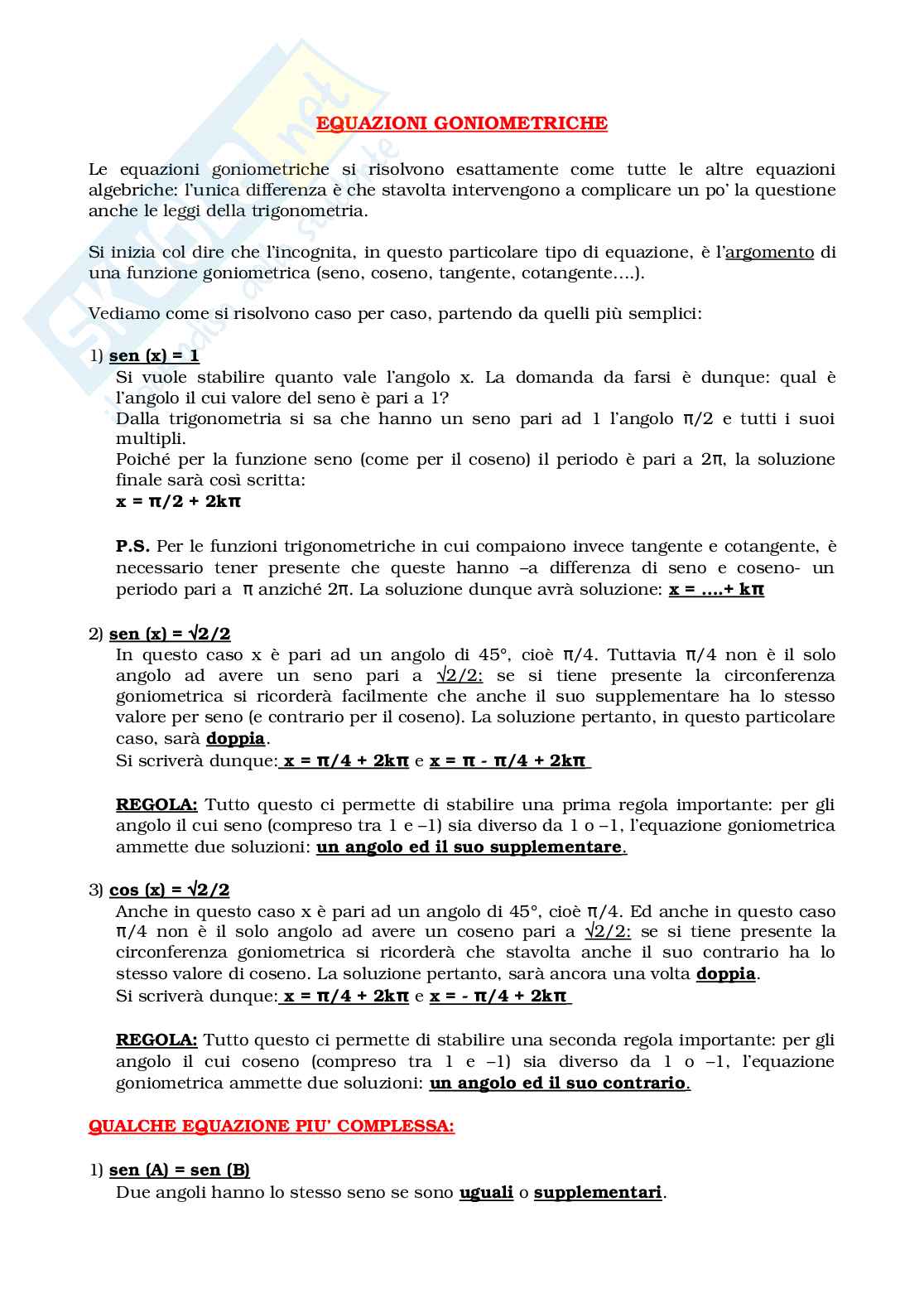 Le successive pagine, presenti sottoforma di allegato poichè contengono diverse formule matematiche, sono un piccolo vademecum per risolvere le equazioni goniometriche, importante argomento affrontato nei corsi di trigonometria delle scuole superiori.