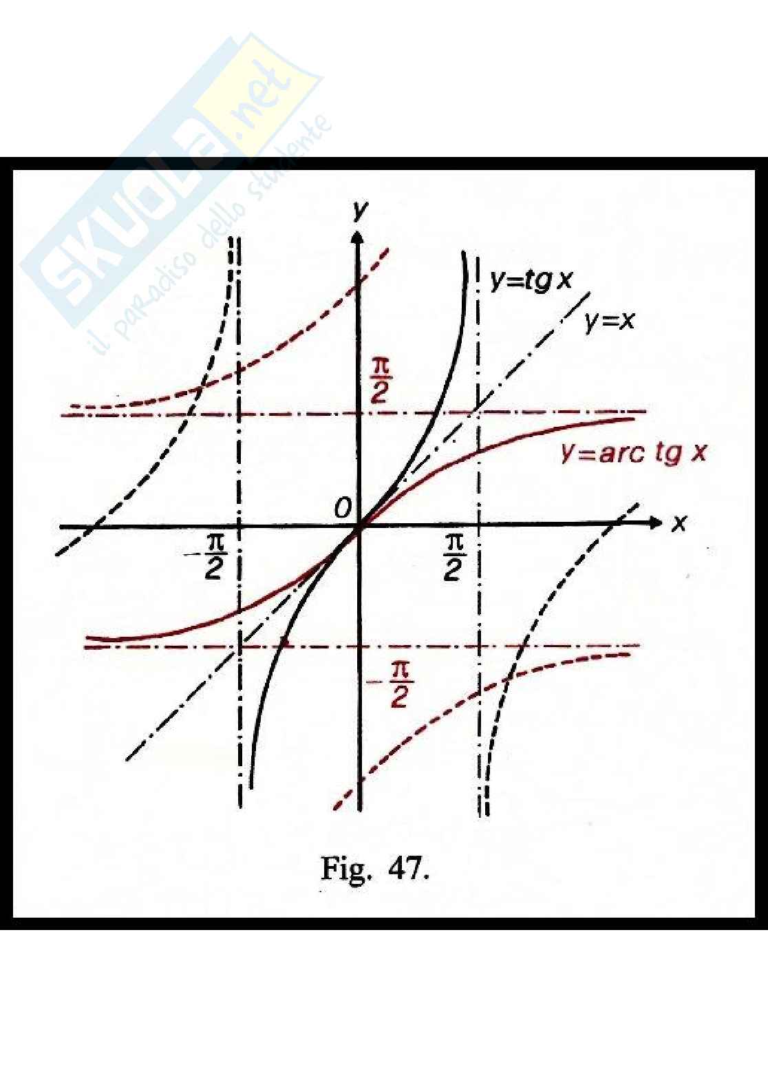 In particolare, come tutte le funzioni inverse, il grafico della funzione arcotangente (FIGURA in allegato) è ottenuto da quello della sua funzione diretta, cioè quello noto della funzione tangente, a cui risulta simmetrico rispetto alla bisettrice del primo e del terzo quadrante.