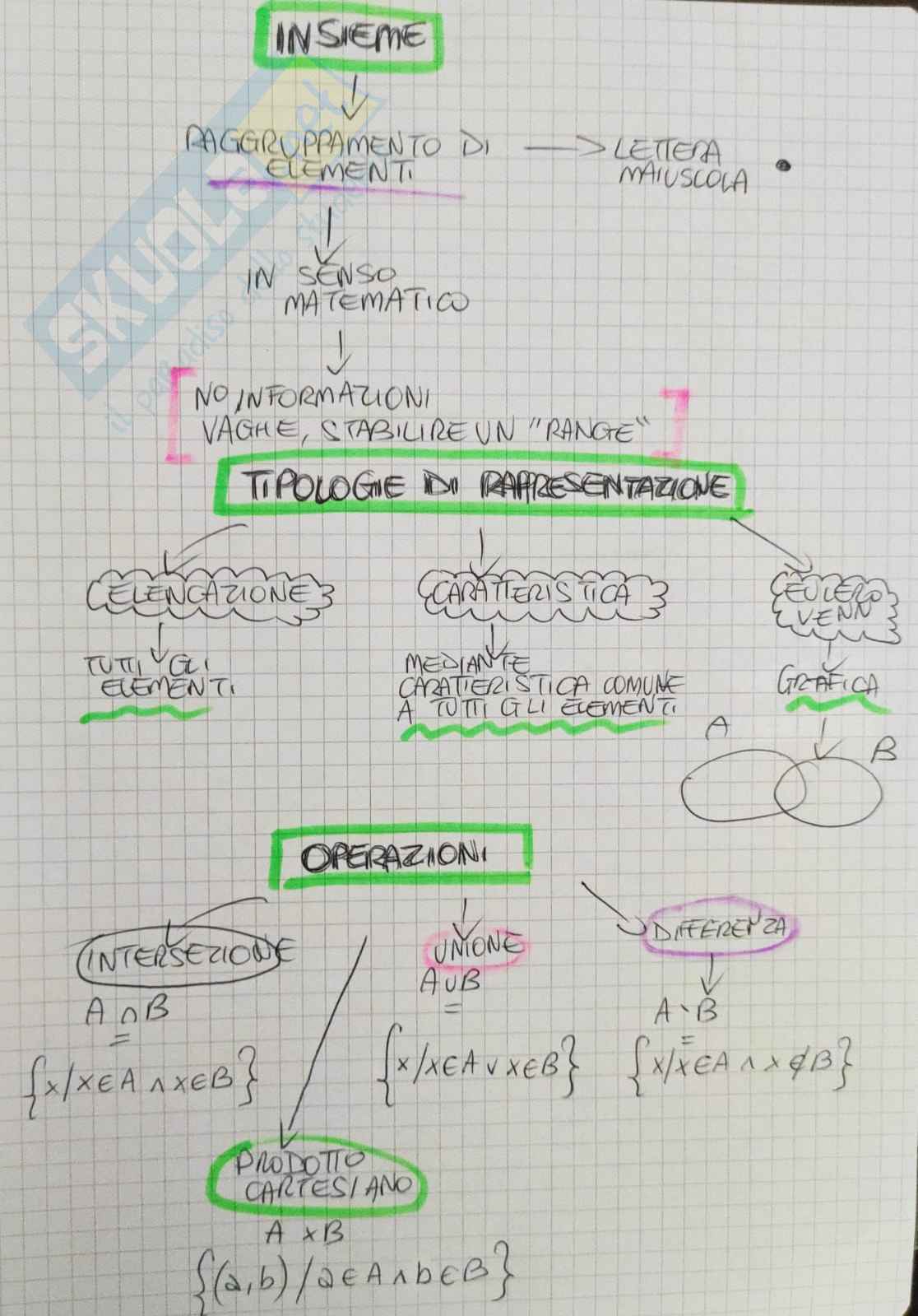 - il prodotto cartesiano, in cui si associano a coppie (dette copie cartesiane) un elemento appartenente al primo insieme e un altro appartenente al secondo. È bene soffermarsi su questo punto, perché non vale la proprietà commutativa: dire A X B è diverso da dire B X A; infatti bisogna rispettare la regola per la quale il primo elemento della coppia ordinata appartiene al primo fattore del prodotto, mentre il secondo appartiene al secondo insieme considerato.