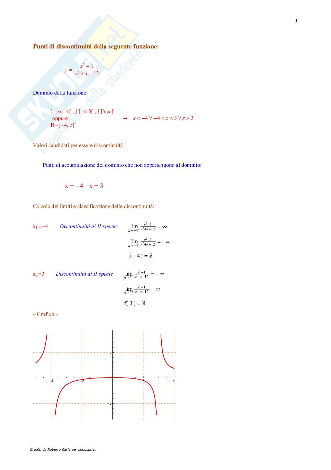In questo caso il denominatore si annulla per i valori 3 e -4 ma il numeratore no quindi si hanno discontinuità di II specie (vedi calcoli allegati)