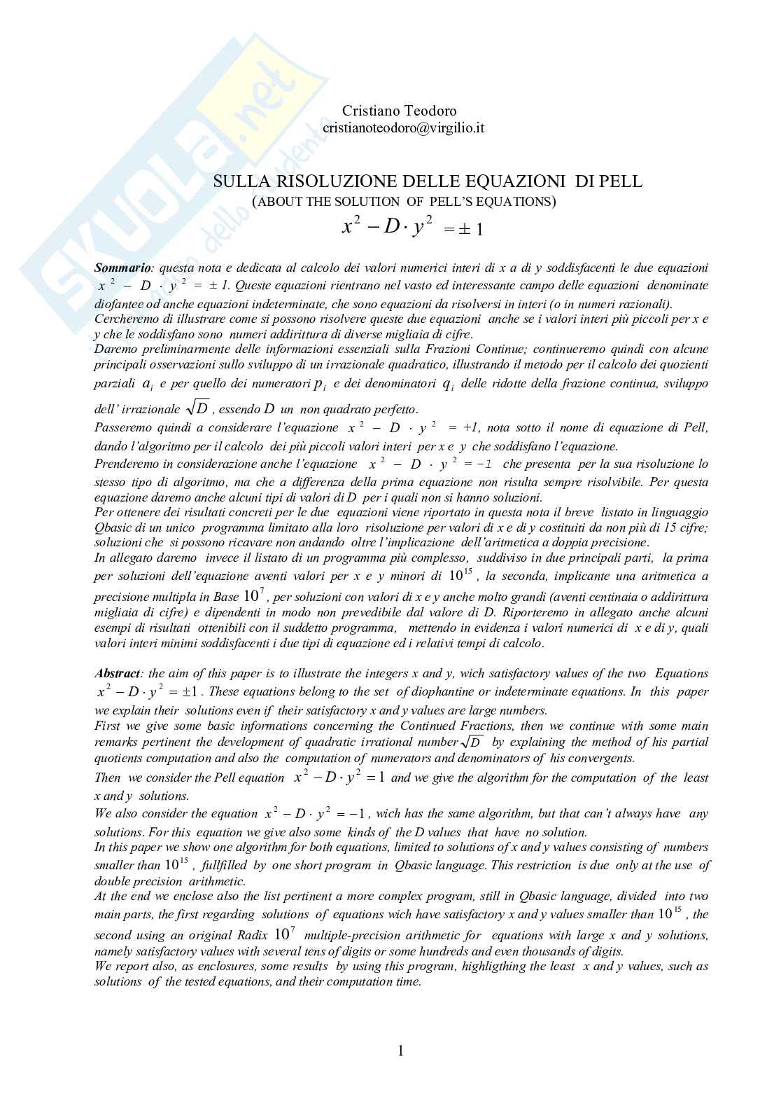 indispensabile per la risoluzione dell’equazione di Pell, occorre trovare un algoritmo efficiente e