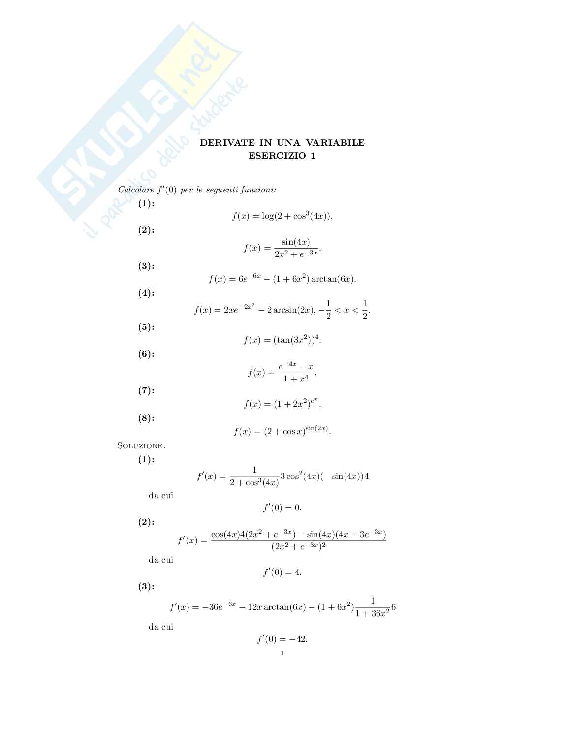 Da cui f zero zero. Sostituendo per quattro. Quando la funzione numero due è una funzione razionale funzione fratta, quindi la derivata si ottiene come derivata il numeratore per il denominatore non derivato meno numeratore e denominatore derivato tutto fratto il denominatore al quadrato. Quindi procedendo come prima, se ogni quattro x ha una funzione composta quindi di numeratore derivate coseno di 4X4, moltiplico per il denominatore derivato meno numeratore meno seno di quattro x che moltiplicato per il denominatore è quattro x deriva tre due x la seconda meno tre e meno tre x che la derivata della esponenziale è almeno 3X3, fatto esponenziale che alla x e alla x stesso per la derivata dell'argomento cammino tutto fratto denominatore al quadrato risultato finale calcolato in zero quattro. In modo analogo si procede per le altre derivate, l'unica derivata un po diversa dal solito il numero, poi la funzione numero otto in quanto una funzione esponenziale.
