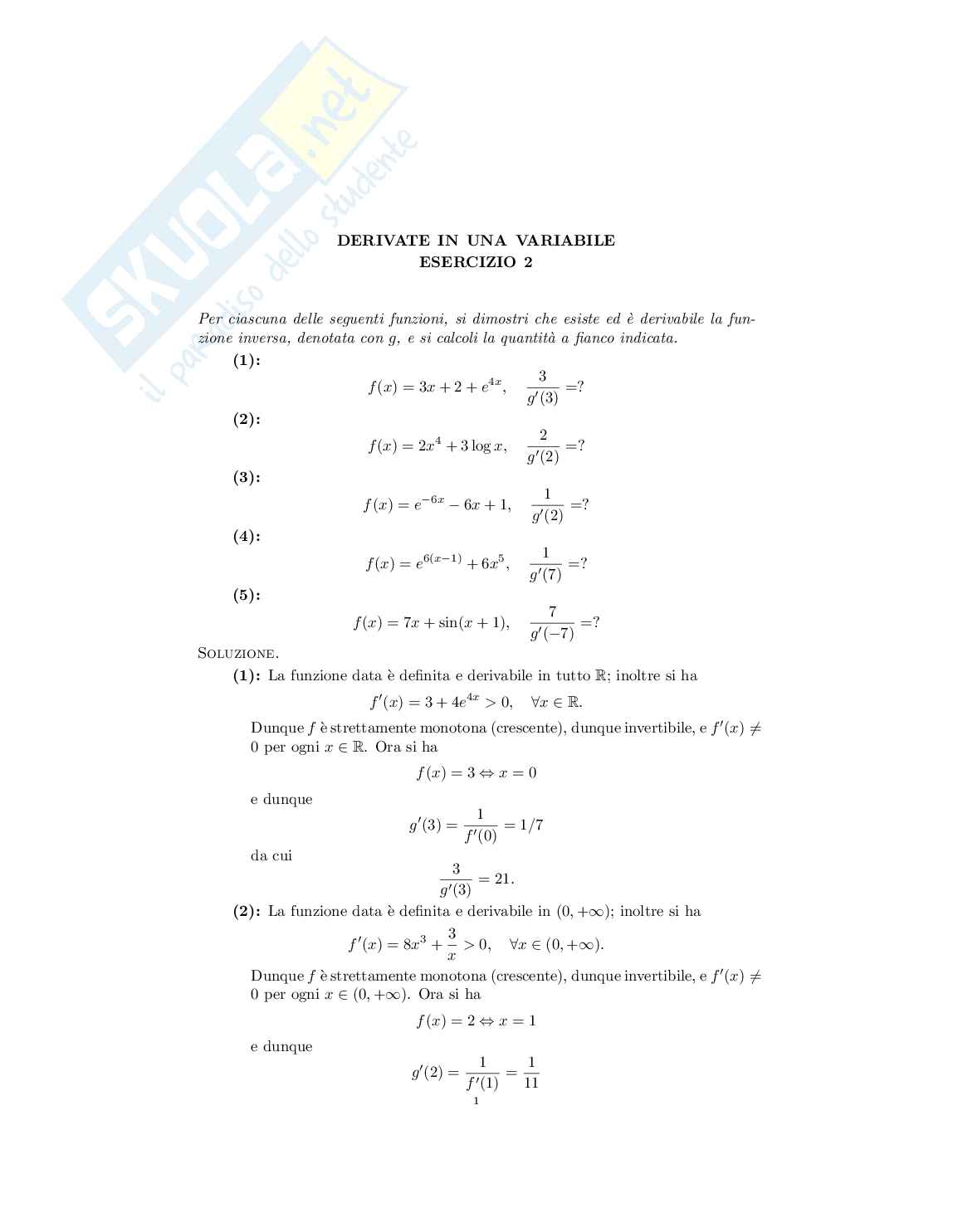 (1): La funzione data è definita e derivabile in tutto inoltre si ha