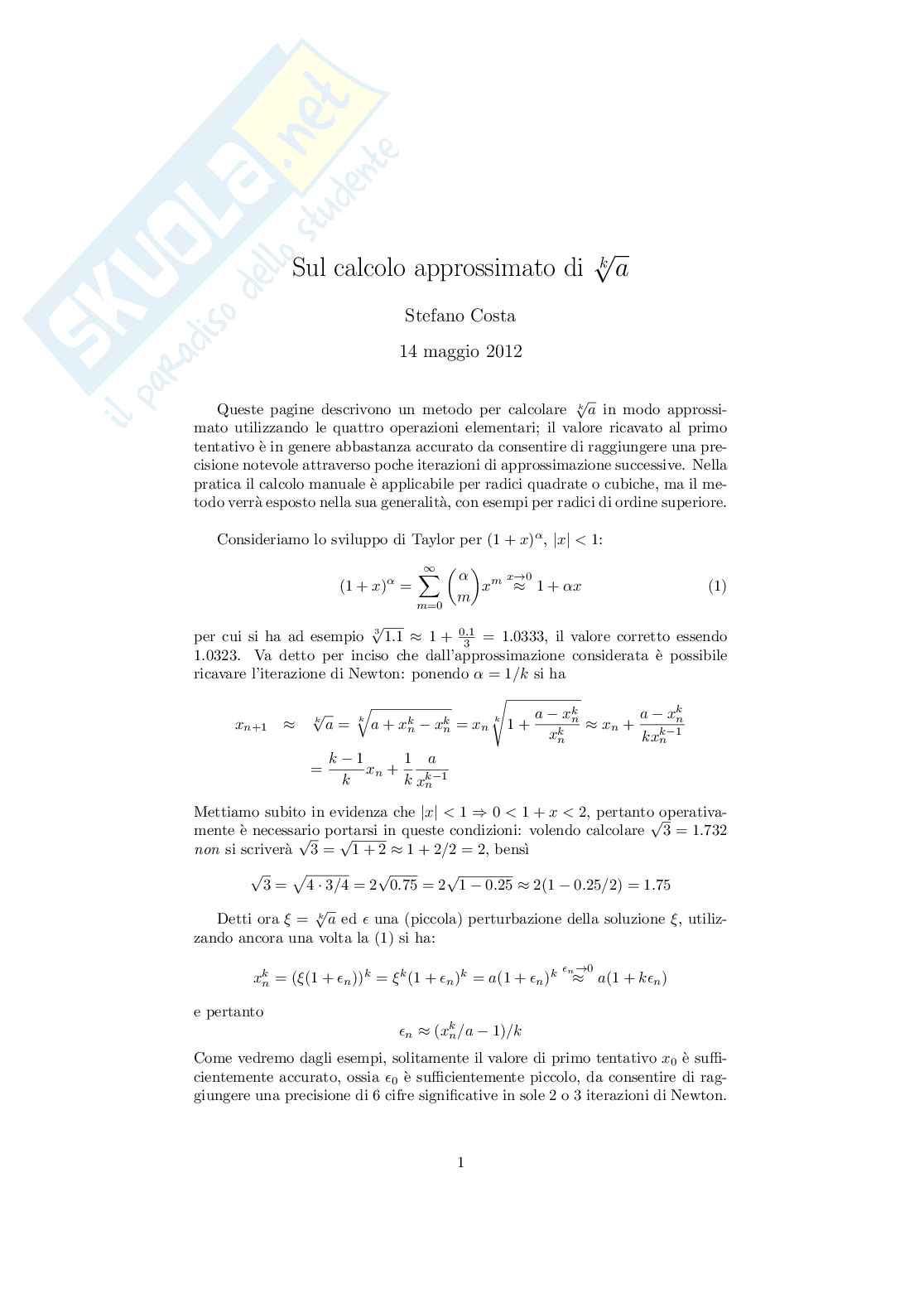 Queste pagine descrivono un metodo per calcolare Stefano Costa, Sul calcolo approssimato di radice di indice k di a