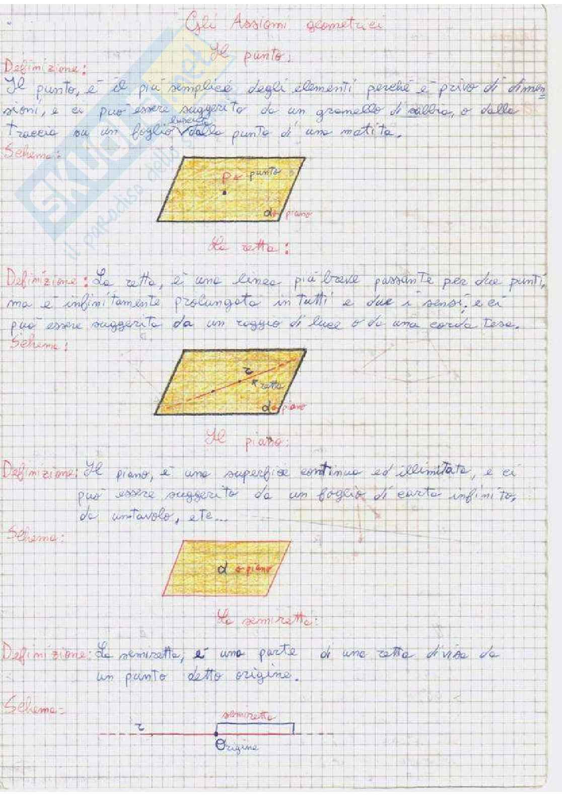 Nell'allegato sono presenti le definizioni generali di punto, retta, piano e semi retta, le quali utilizzano gli assiomi geometrici.