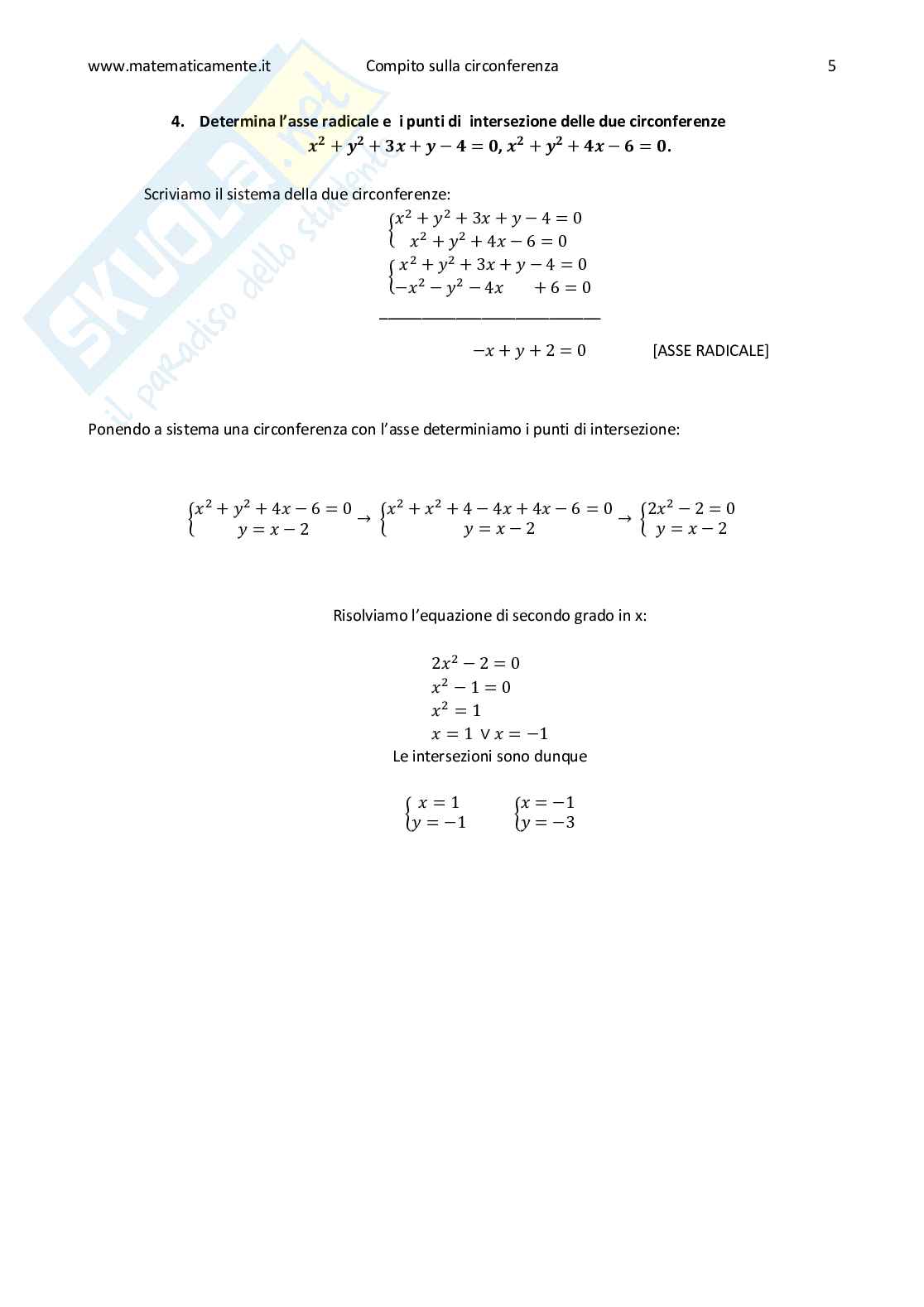 Determina l'asse radicale e i punti di intersezione delle due circonferenze [math]{x}^{2}+{y}^{2}+{3}{x}+{y}-{4}={0}[/math], [math]{x}^{2}+{y}^{2}+{4}{x}-{6}={0}[/math]. Esercizio sull'asse radicale, scarica il PDF