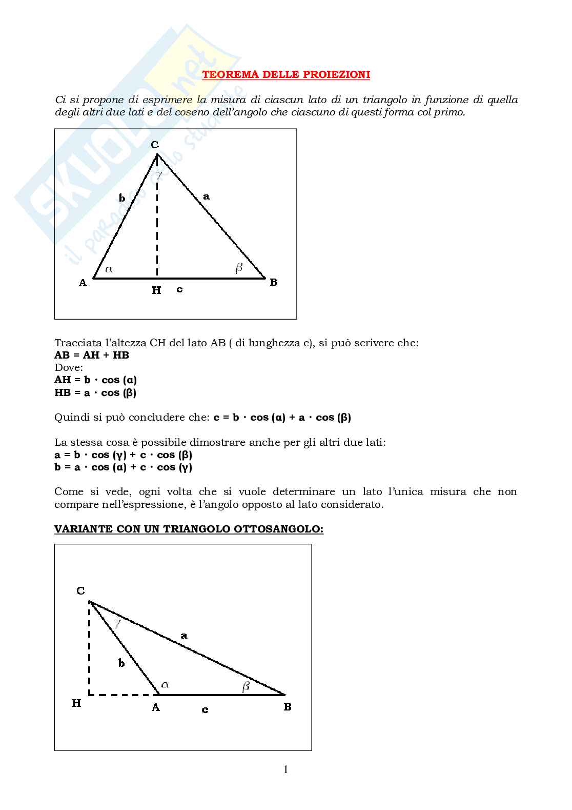 Sia ABC un triangolo acutangolo, di lati a, b, c. Vogliamo dimostrare il teorema per il alto AB. Tracciata l’altezza CH, AB resta diviso in due parti AH e HB. che sono le proiezioni ortogonali rispettivamente dei lati AC e BC, sulla retta che contiene la base del triangolo. Ecco perché il teorema prende questo nome. Il triangolo ABC è ora suddiviso in due triangoli rettangoli che hanno un cateto in comune (CH), nei quali le due proiezioni sono due cateti. Non resta che applicare il primo teorema dei triangoli rettangoli sia al lato AH che al lato HB. Nel documento allegato è svolta la dimostrazione sia nel caso generale di un triangolo acutangolo che nel caso particolare del triangolo ottusangolo.
