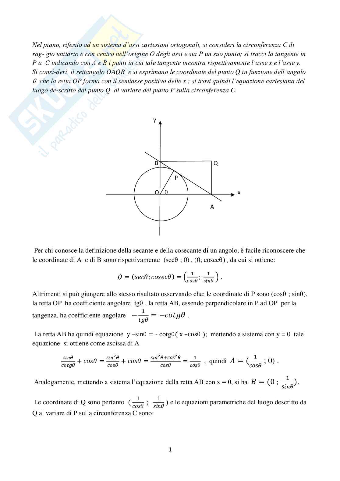Nel piano, riferito ad un sistema d'assi cartesiani ortogonali, si consideri la circonferenza C di raggio unitario e con centro nell'origine O degli assi e sia P un suo punto; si tracci la tangente in P a C indicando con A e B i punti in cui tale tangente incontra rispettivamente l'asse x e l'asse y. Si consi-deri il rettangolo OAQB e si esprimano le coordinate del punto Q in funzione dell'angolo θ che la retta OP forma con il semiasse positivo delle x ; si trovi quindi l'equazione cartesiana del luogo descritto dal punto Q al variare del punto P sulla circonferenza C.