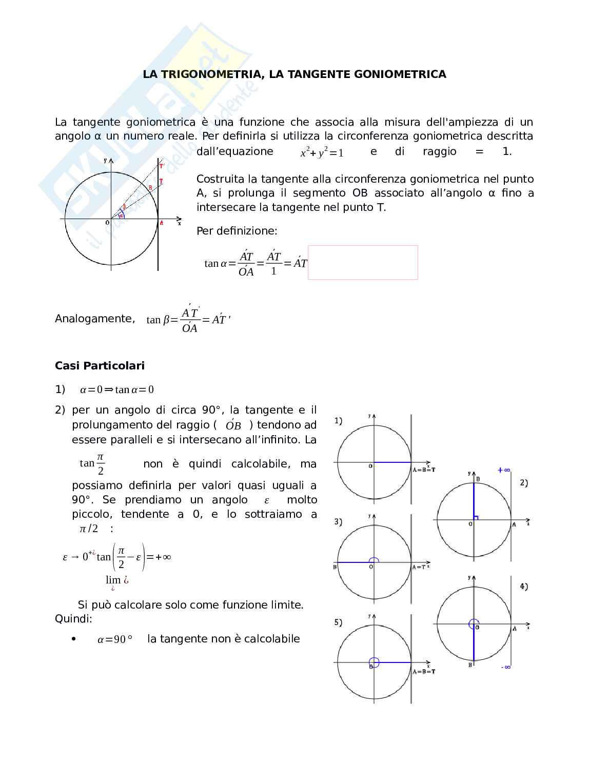 La tangente goniometrica è una funzione che associa alla misura dell'ampiezza di un angolo α un numero reale. Per definirla si utilizza la circonferenza goniometrica descritta dall’equazione