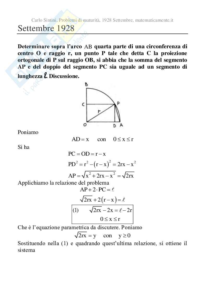 Carlo Sintini, Maturità scientifica Settembre 1928, Prova di matematicaCarlo Sintini, Problemi di maturità, 1928 Settembre, matematicamente.it