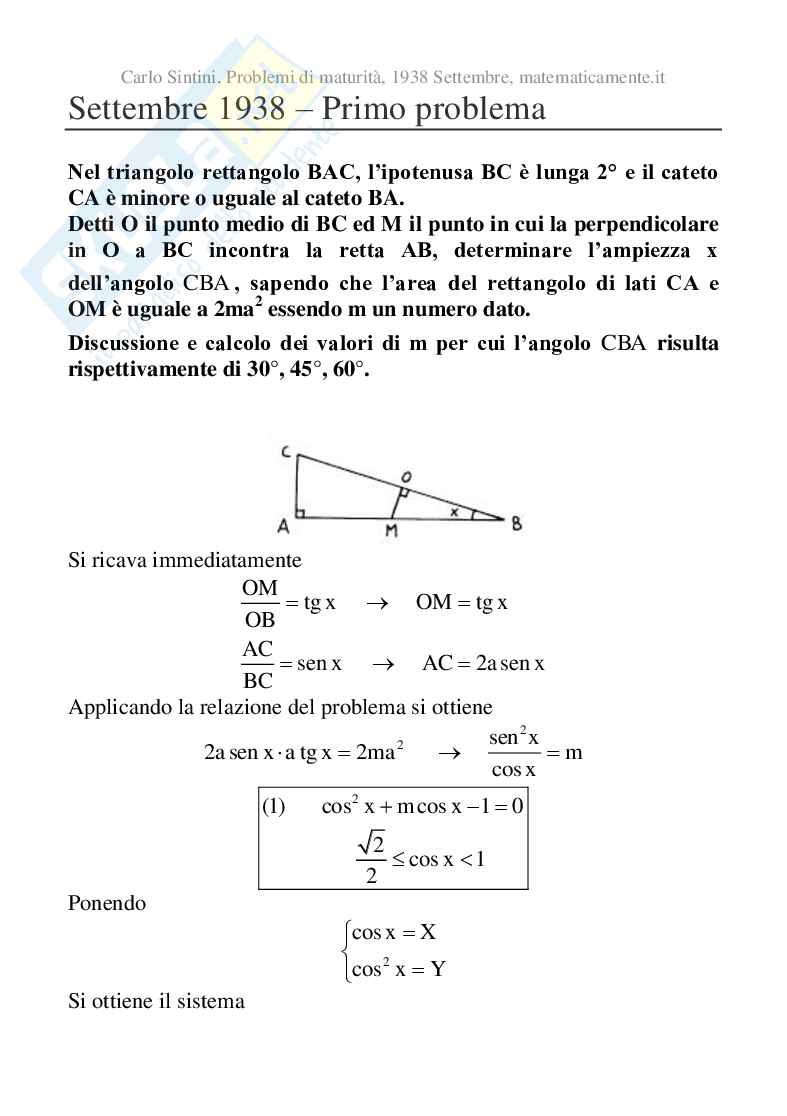 Carlo Sintini, Problemi di maturità, 1938 Settembre, matematicamente.it