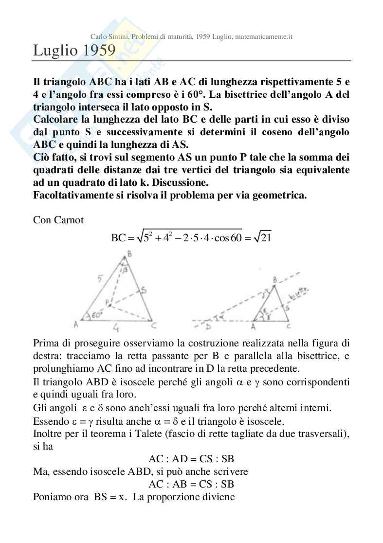 Carlo Sintini, Problemi di maturità, 1959 Luglio, matematicamente.it