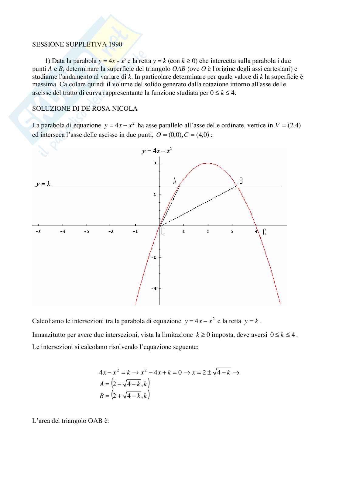 1) Data la parabola y = 4x - x e la retta y = k (con k 0) che intercetta sulla parabola i due