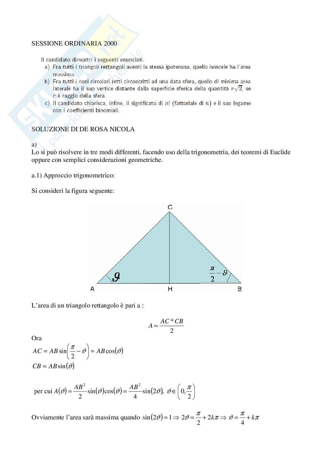 Ora essendo AB= una costante ed assegnata allora la massimizzazione dell’area la si ha se viene