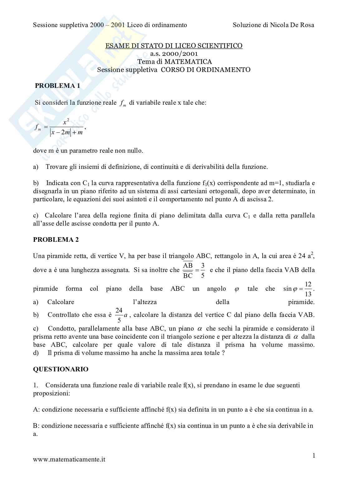 Prova d'esame svolta per il liceo scientifico di ordinamento, sessione suppletiva dell'a.s. 2000/2001 Sessione suppletiva 2000 – 2001 Liceo di ordinamento Soluzione di Nicola De Rosa