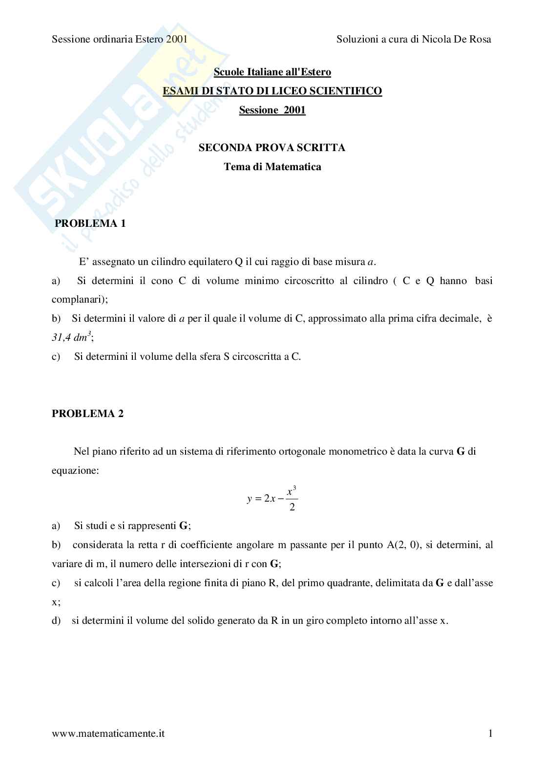 Sessione ordinaria Estero 2001 Soluzioni a cura di Nicola De Rosa