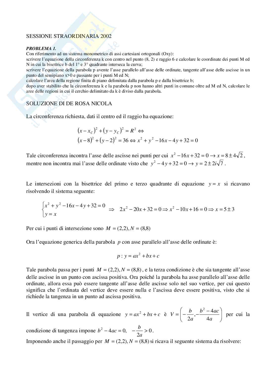 A completamento del problema vanno calcolate le aree in cui la parabola divide la circonferenza.